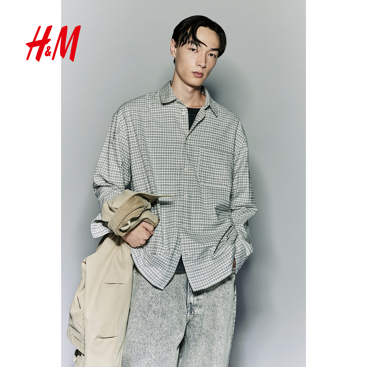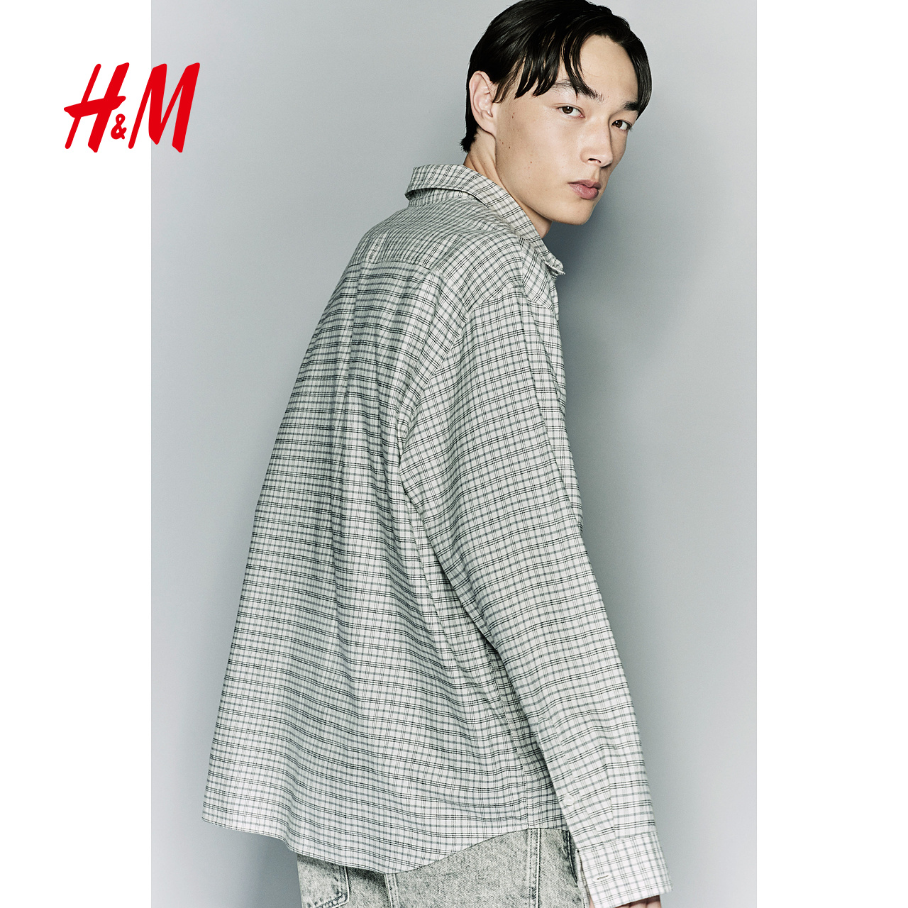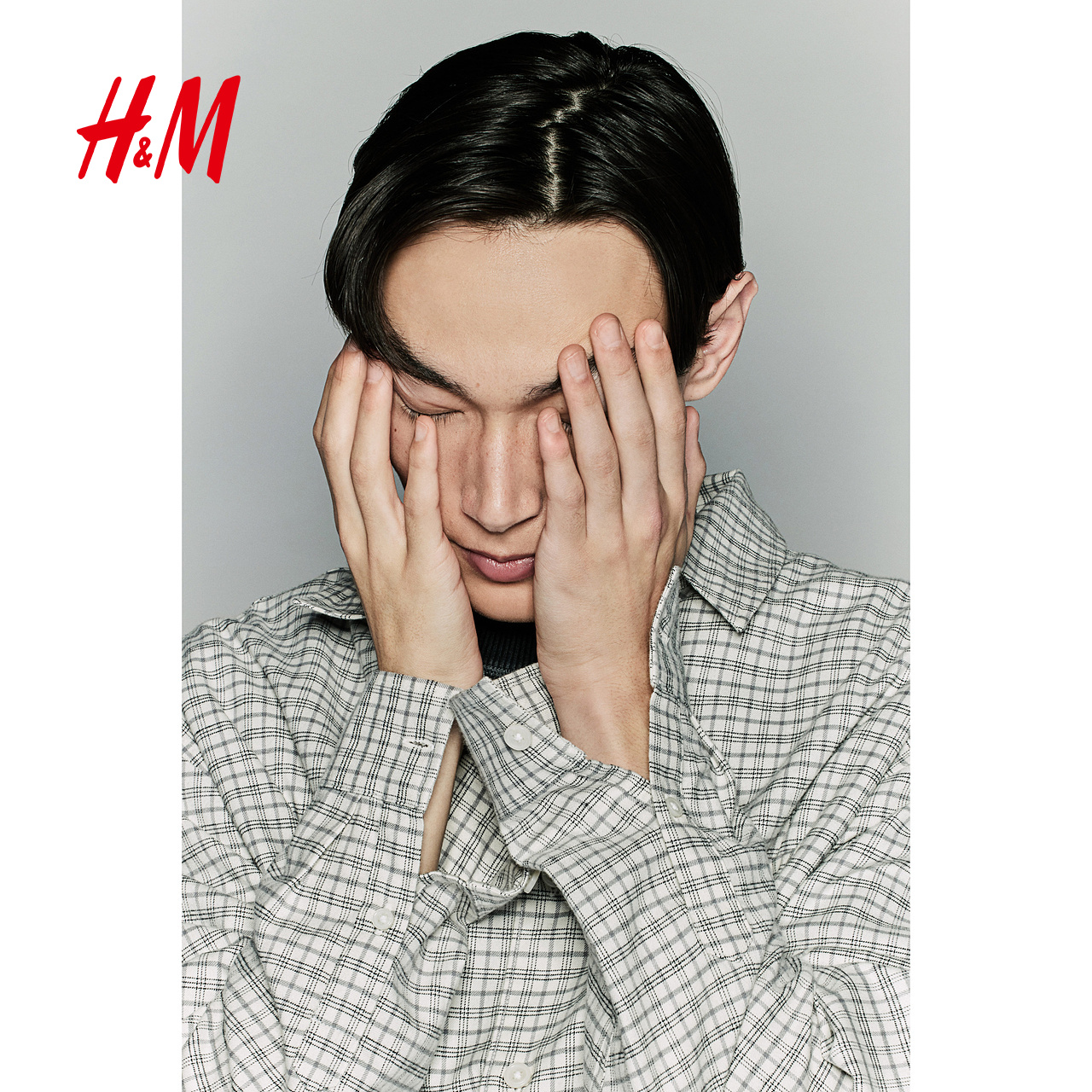 HM男装衬衫美式复古秋季薄外套男生长袖格子衬衣1231416