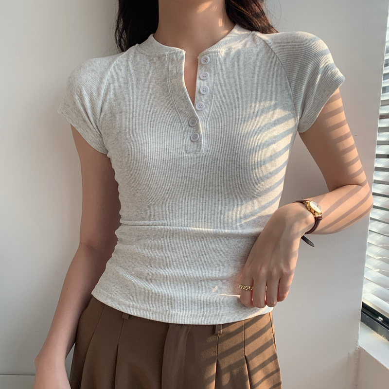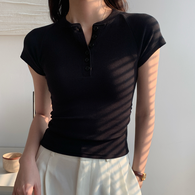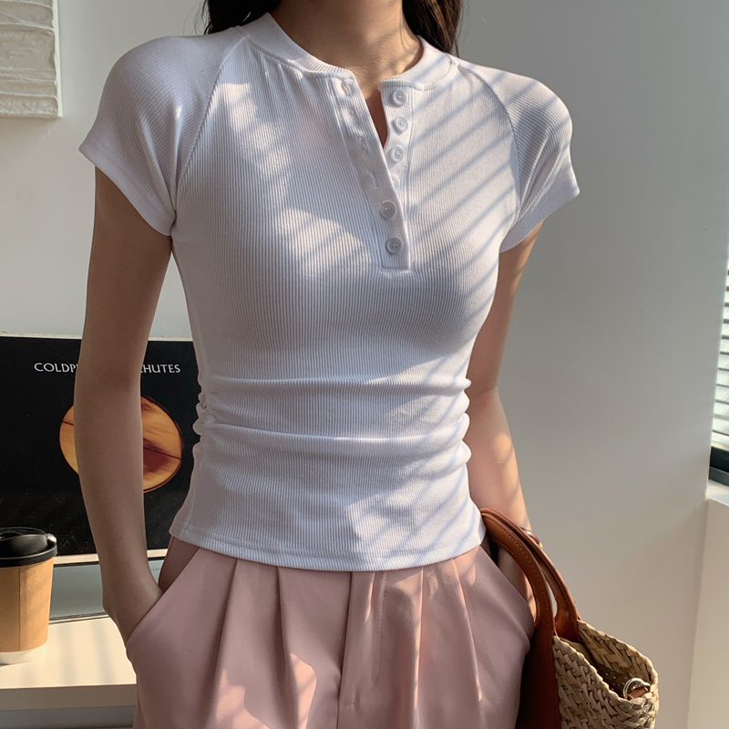 夏半开领美式辣妹半扣领短款修身纯棉螺纹短袖T恤卡腰高腰上衣女