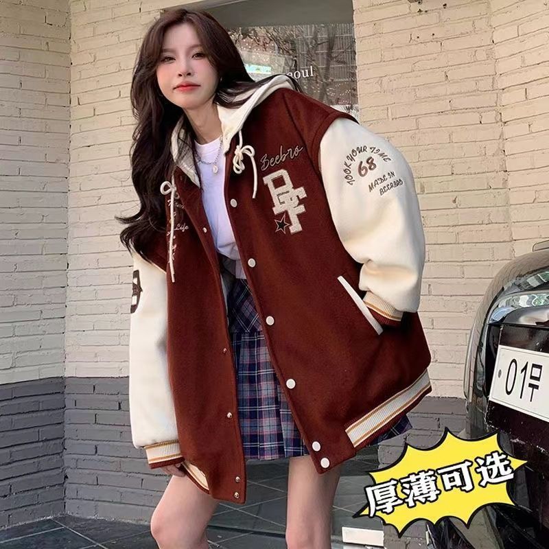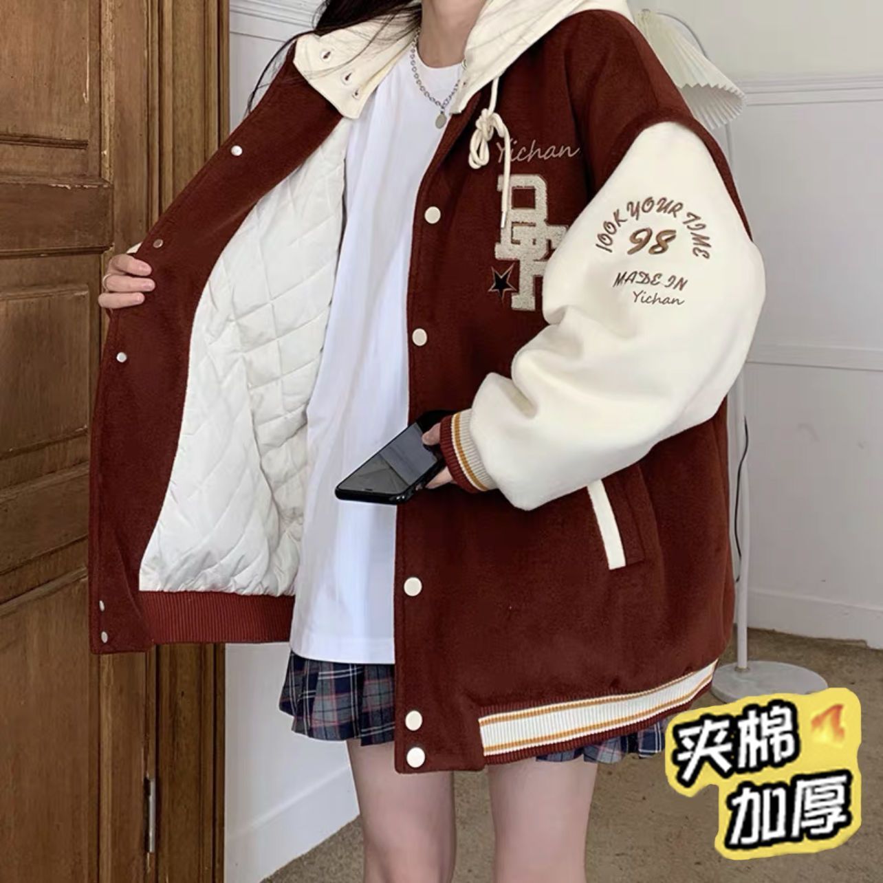复古可拆卸帽子棒球棉服冬季新款宽松韩版学生百搭加棉加厚外套女