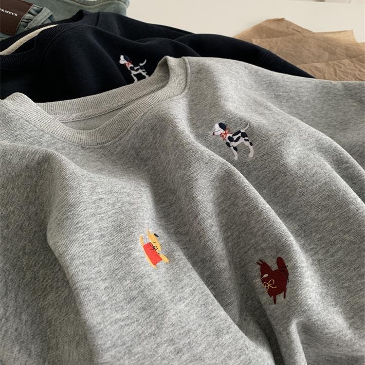 减龄复古彩色小狗刺绣加绒卫衣女秋冬款宽松休闲加厚保暖套头上衣