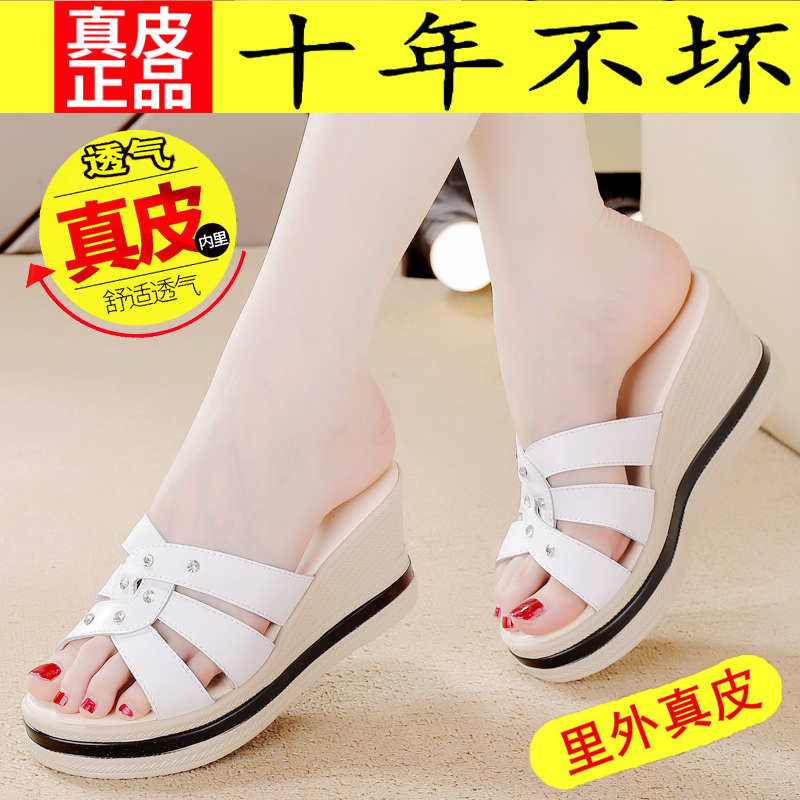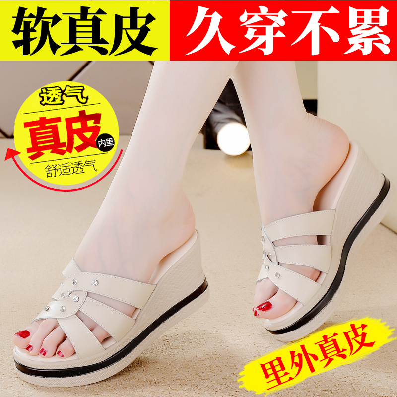 拖鞋女2025夏季新款真皮凉拖鞋女外穿时尚坡跟凉鞋女高跟一字拖鞋