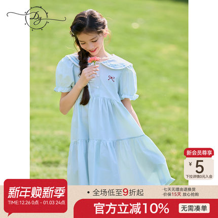 大童女童连衣裙海军领泡泡袖学院风夏季薄款透气收腰显瘦学生裙子