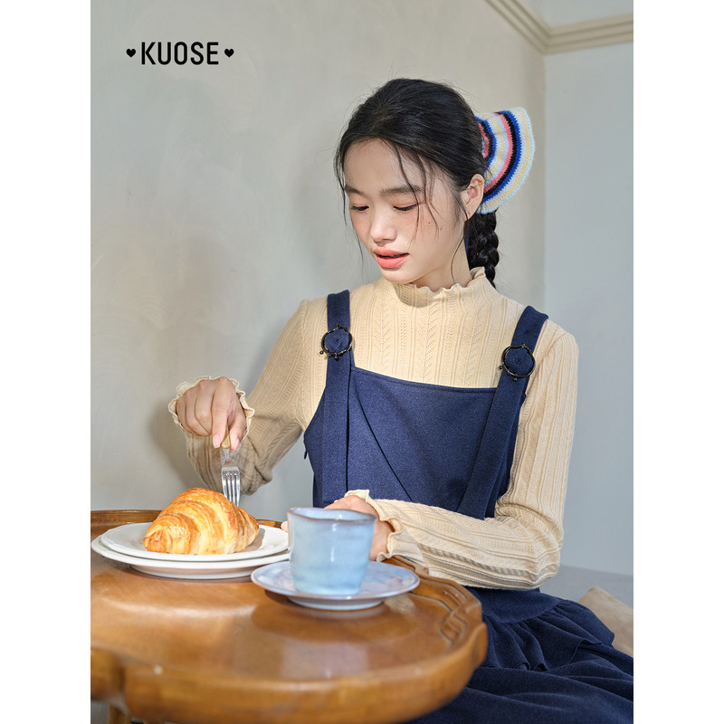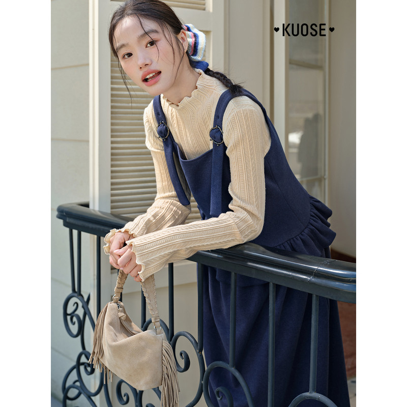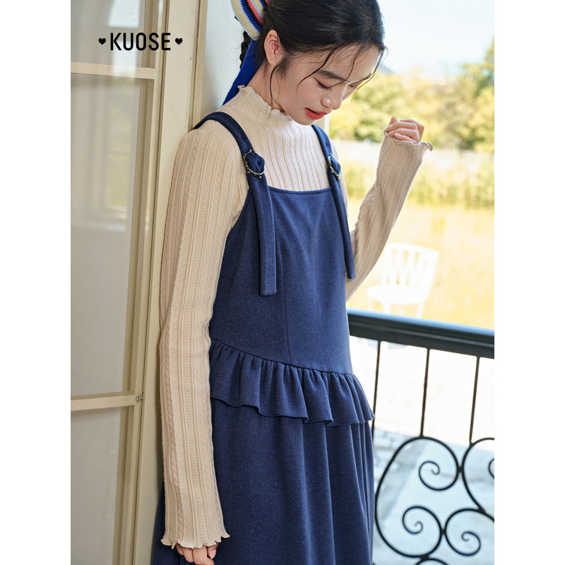 阔色荷叶边拼接背带连衣裙叠穿女25秋冬季新款深蓝色无袖直筒长裙