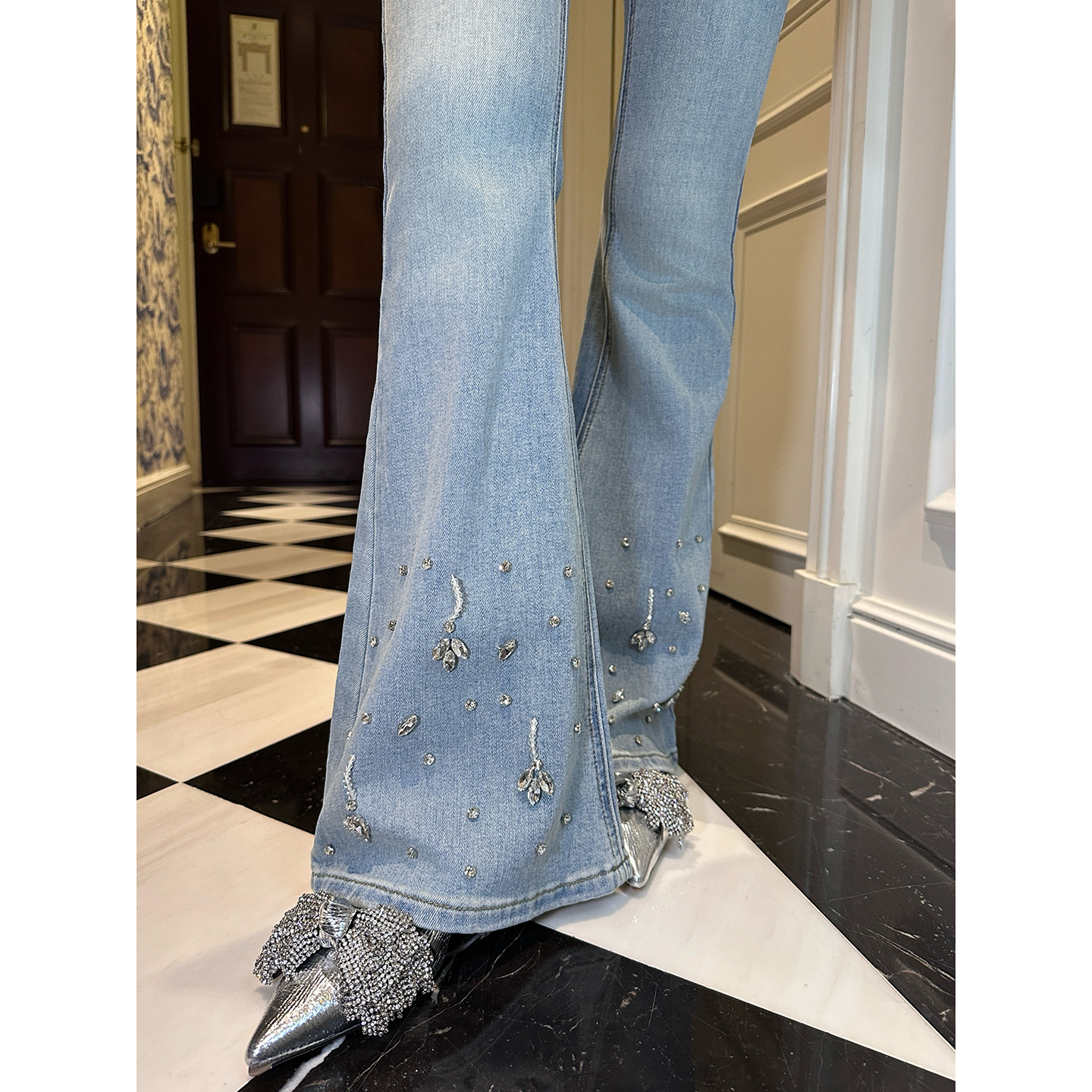 AZZHEN【智性美人】 1周年庆铆钉复古装饰高腰微喇牛仔裤长裤女