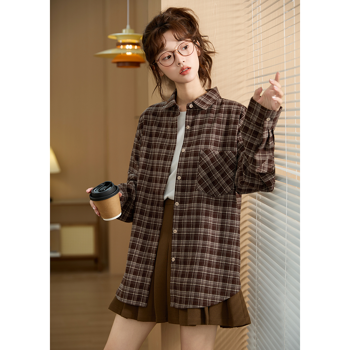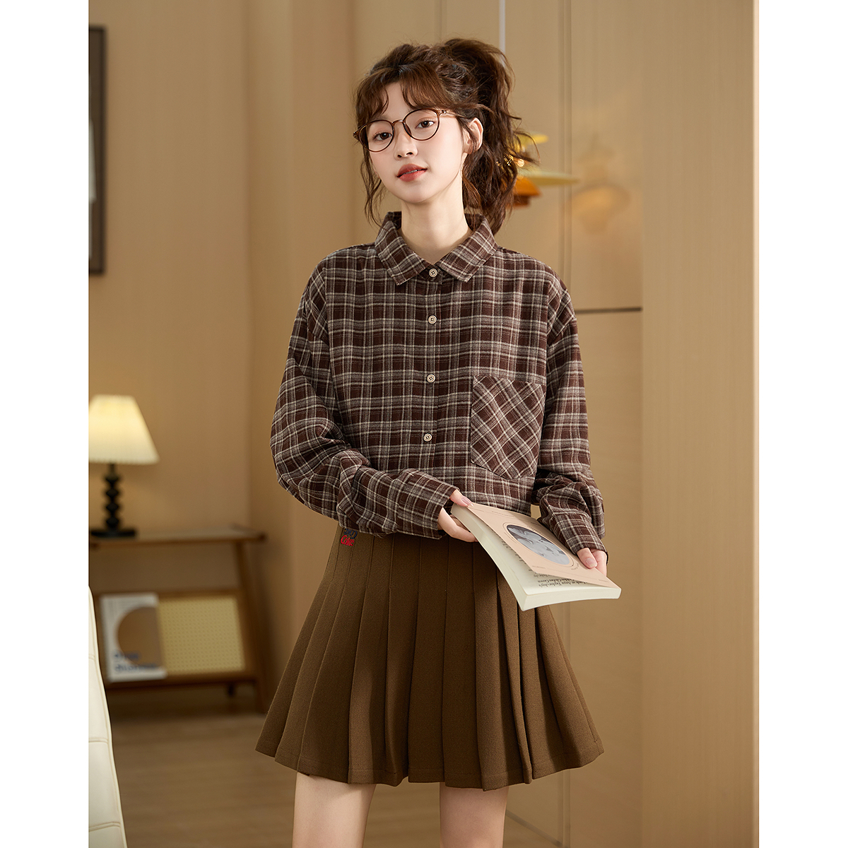 yoe2025年秋季新款长袖衬衫女咖色韩系格纹翻领格子衬衫复古上衣