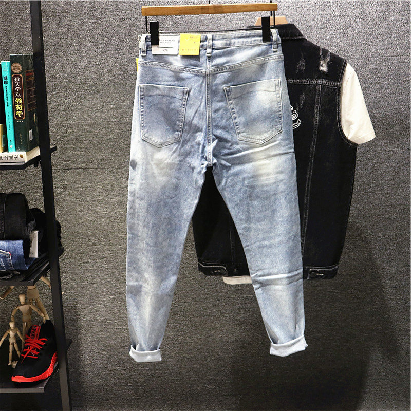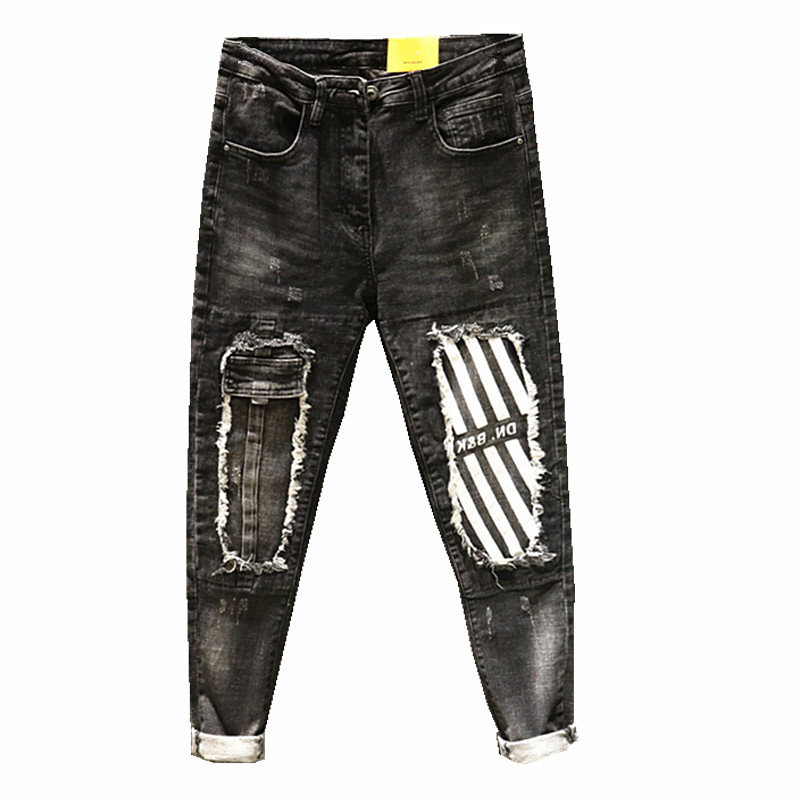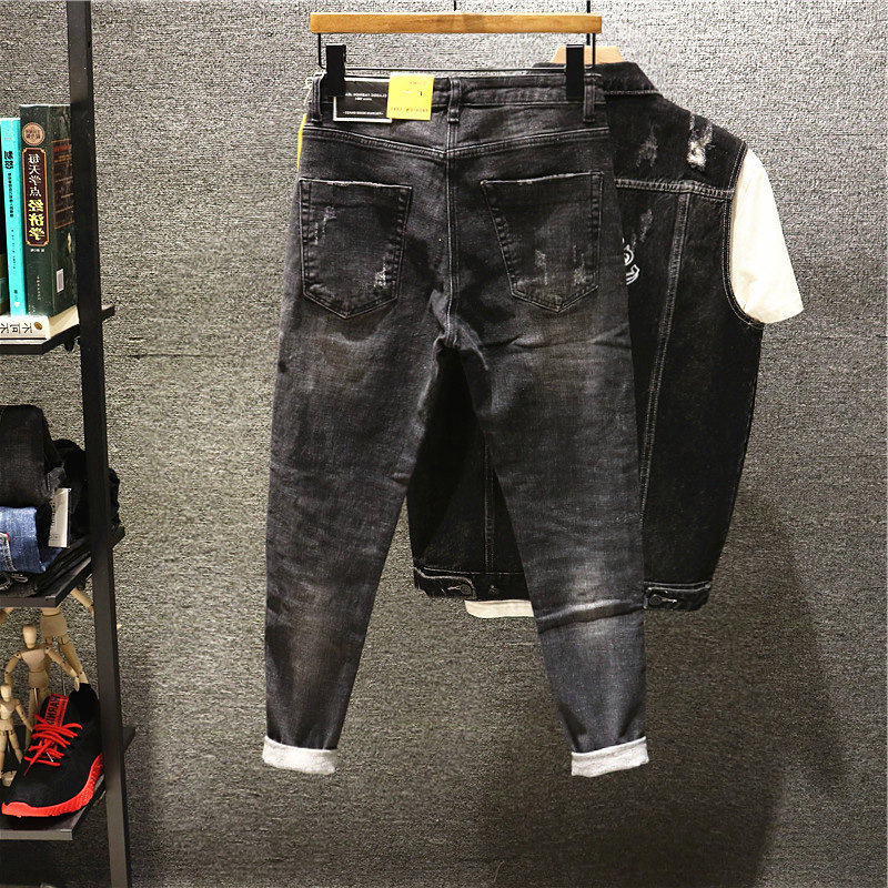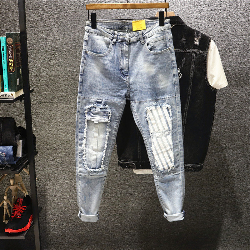 补丁破洞牛仔裤男士2024潮牌夏季新款拼接修身小脚百搭休闲九分裤