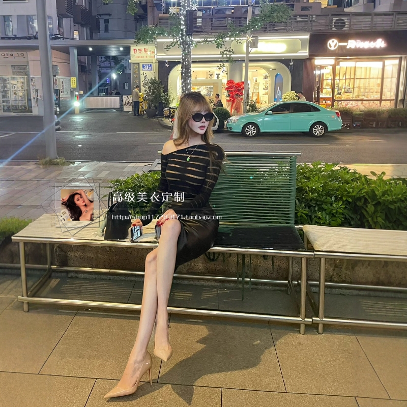 隐晦杀手~御姐黑色性感微透网纱拼接斜肩长袖上衣+PU包臀半身皮裙