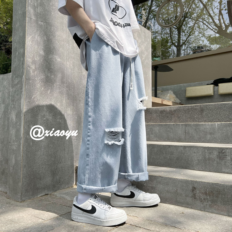 美式破洞牛仔裤男士夏季潮牌宽松直筒潮流休闲九分裤子坠感阔腿裤