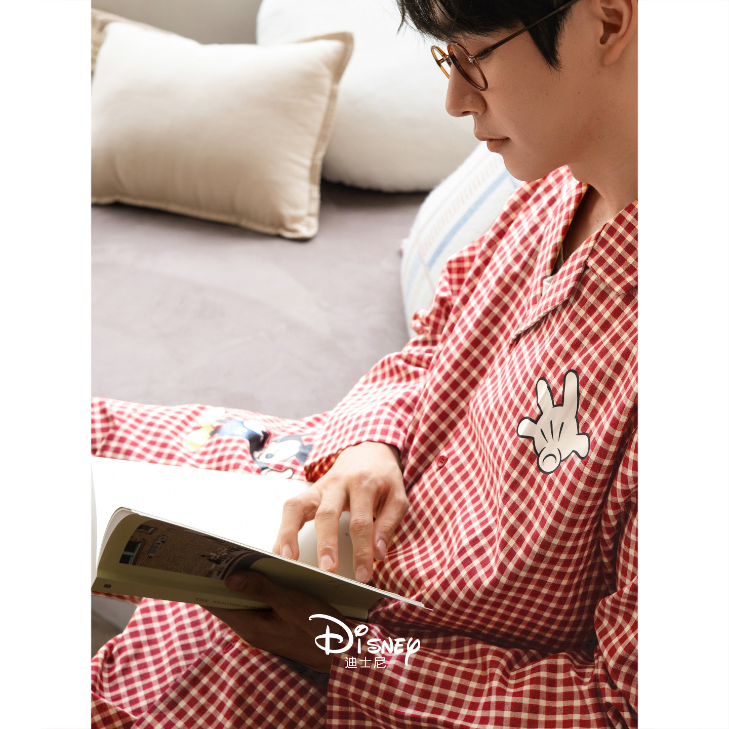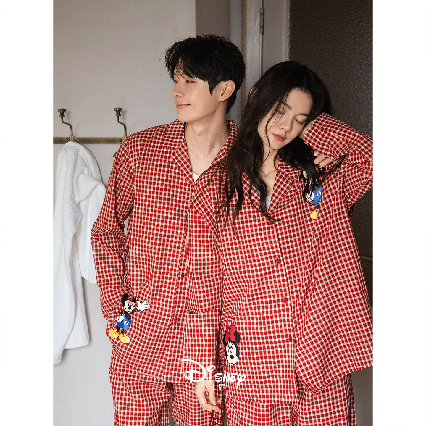 迪士尼新婚情侣睡衣女春秋款红色格子长袖家居服男柔软棉开衫套装