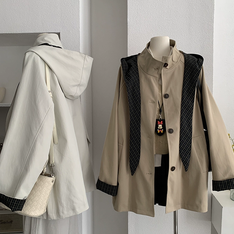 经典可拆卸兔耳朵帽格纹风衣2025秋季新款宽松显瘦中长款大衣外套