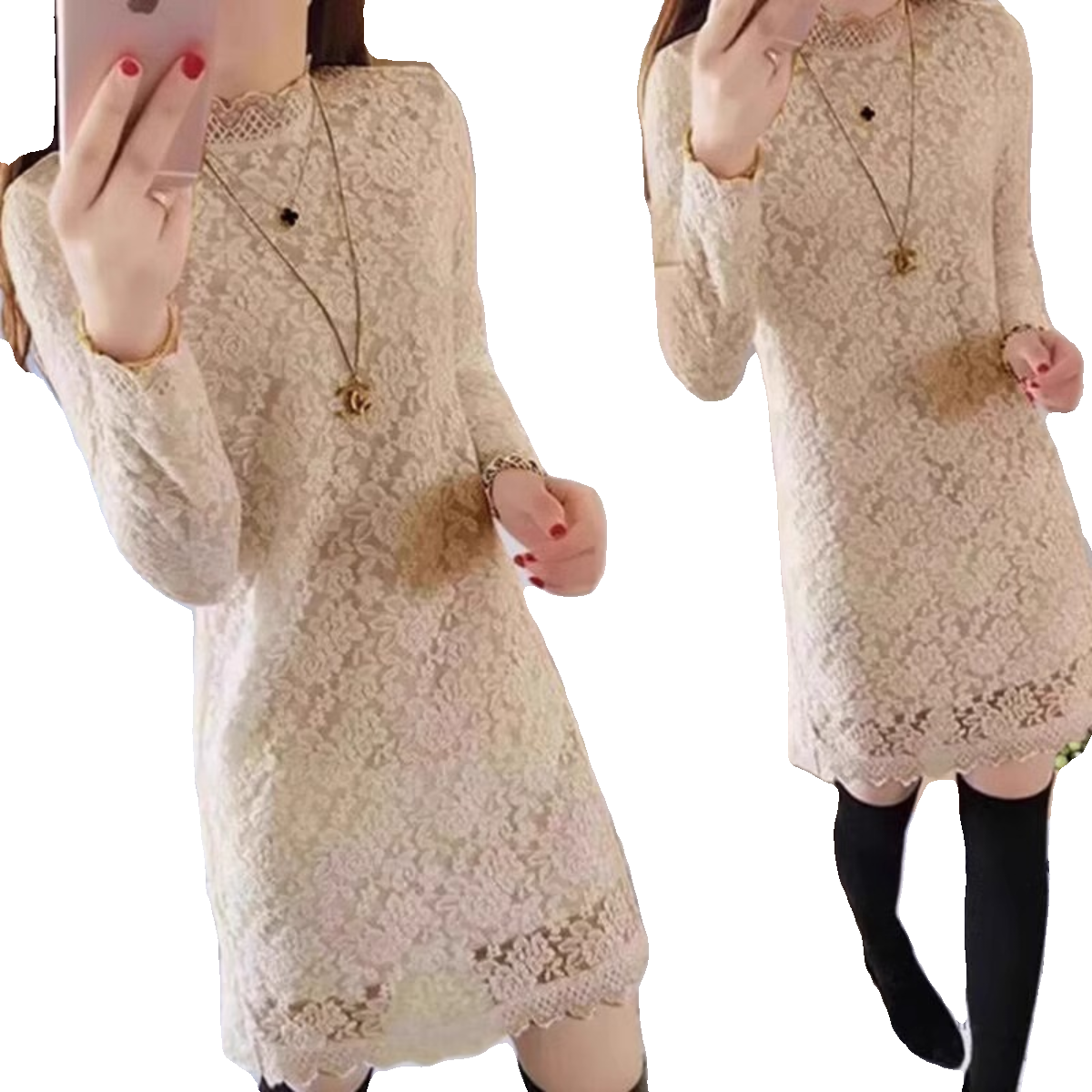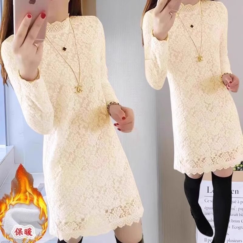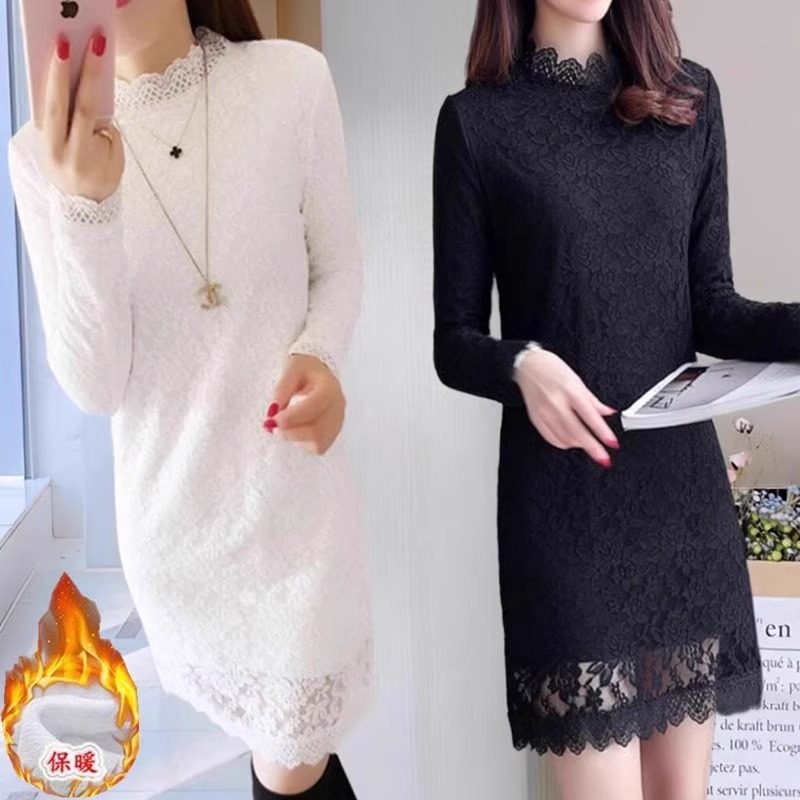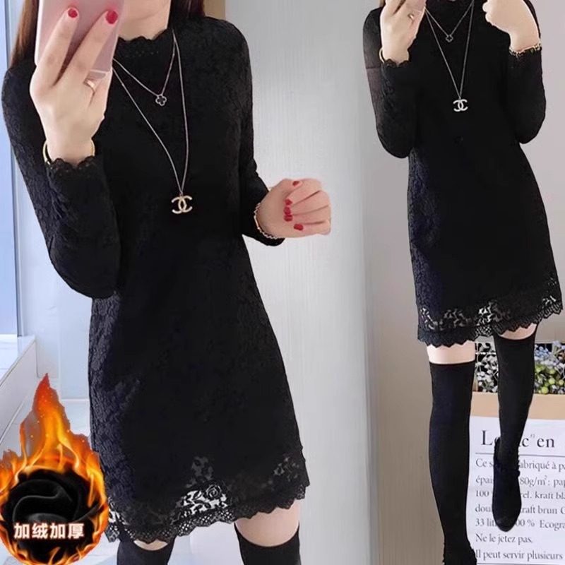 中长款加绒连衣裙女长袖秋冬新款大码加厚上衣蕾丝打底衫t恤裙