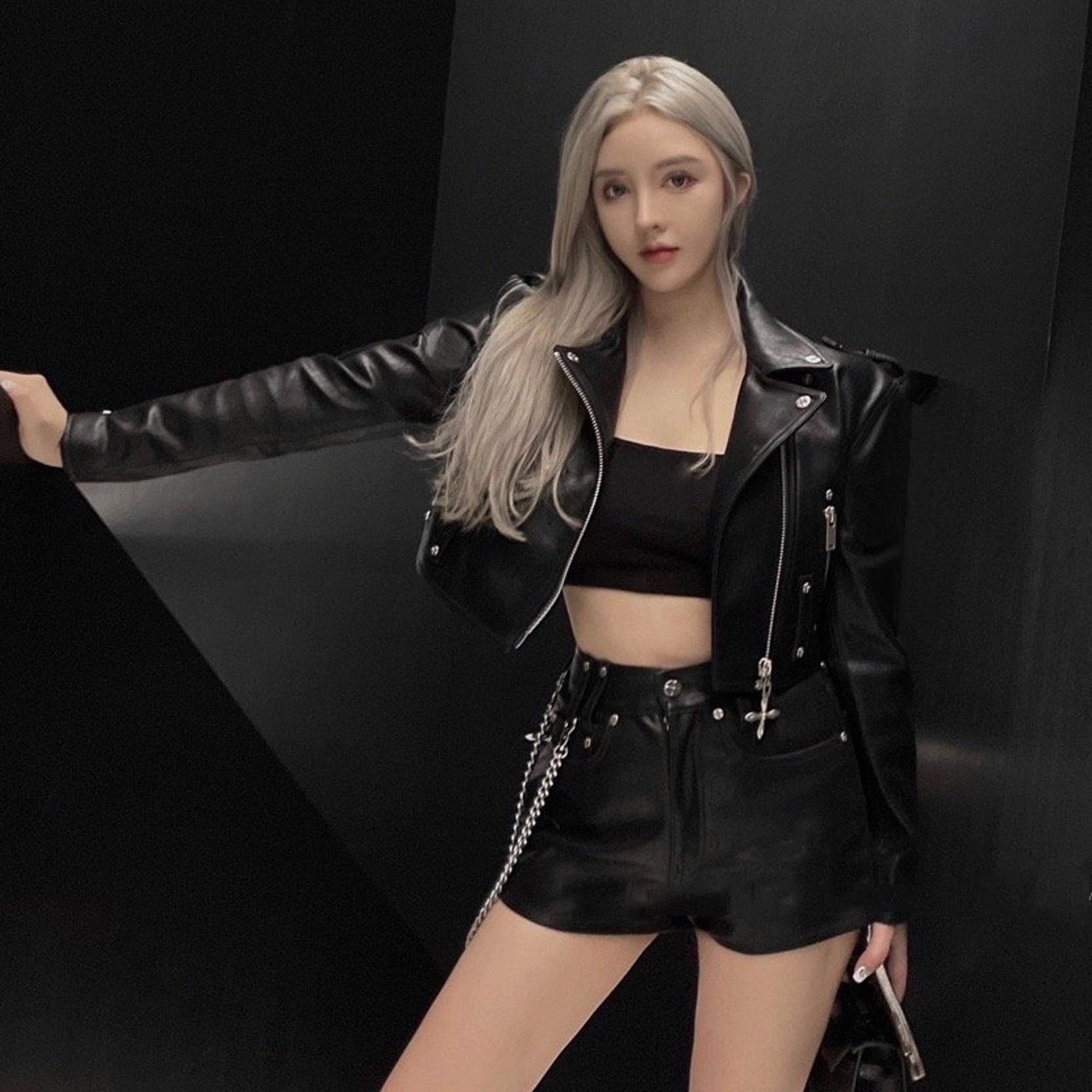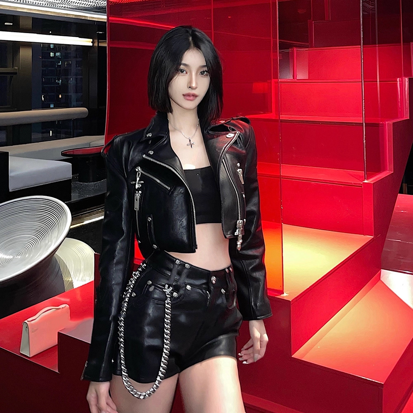 秋季新款摇滚个性休闲pu皮衣西装领外套短款女修身拉链机车夹克女