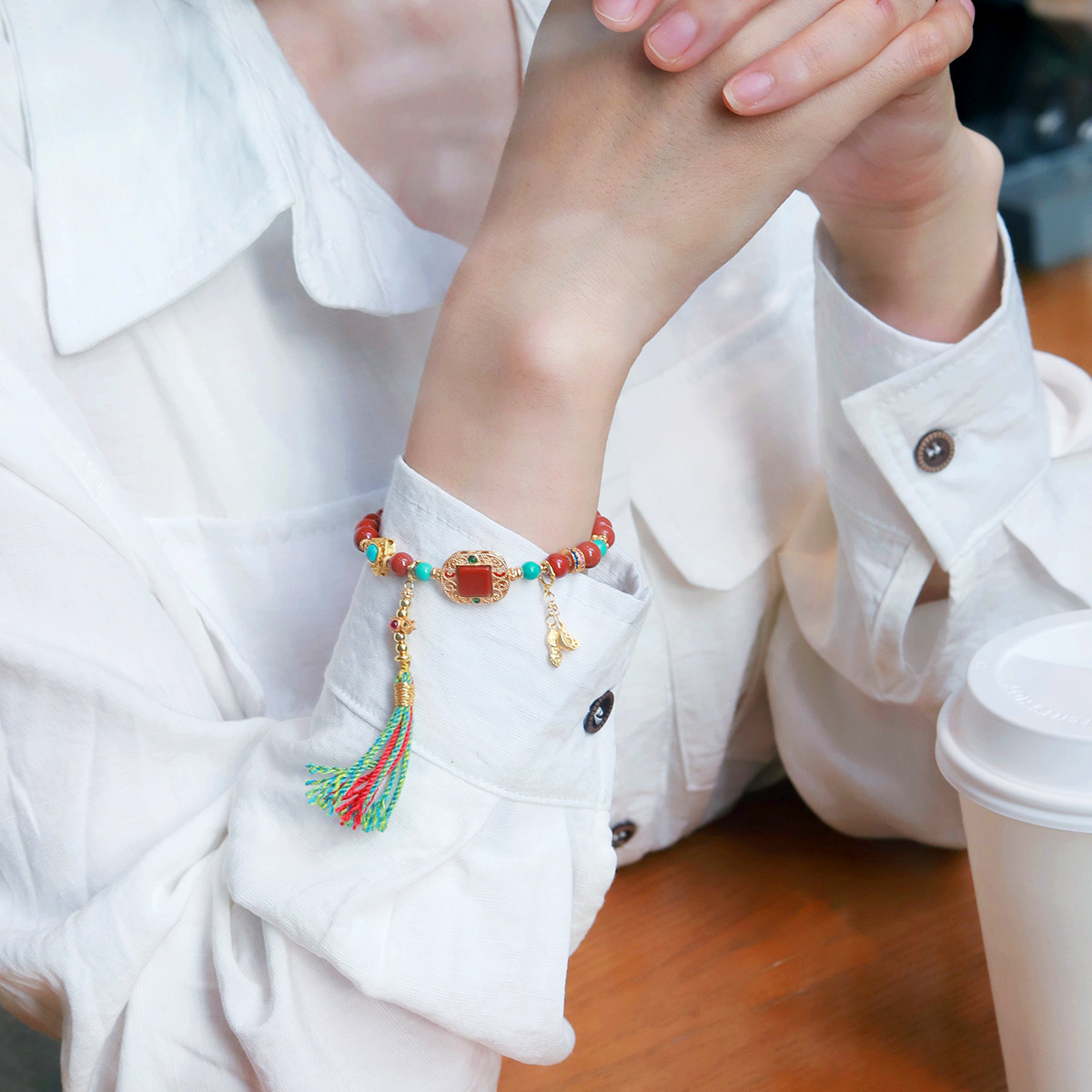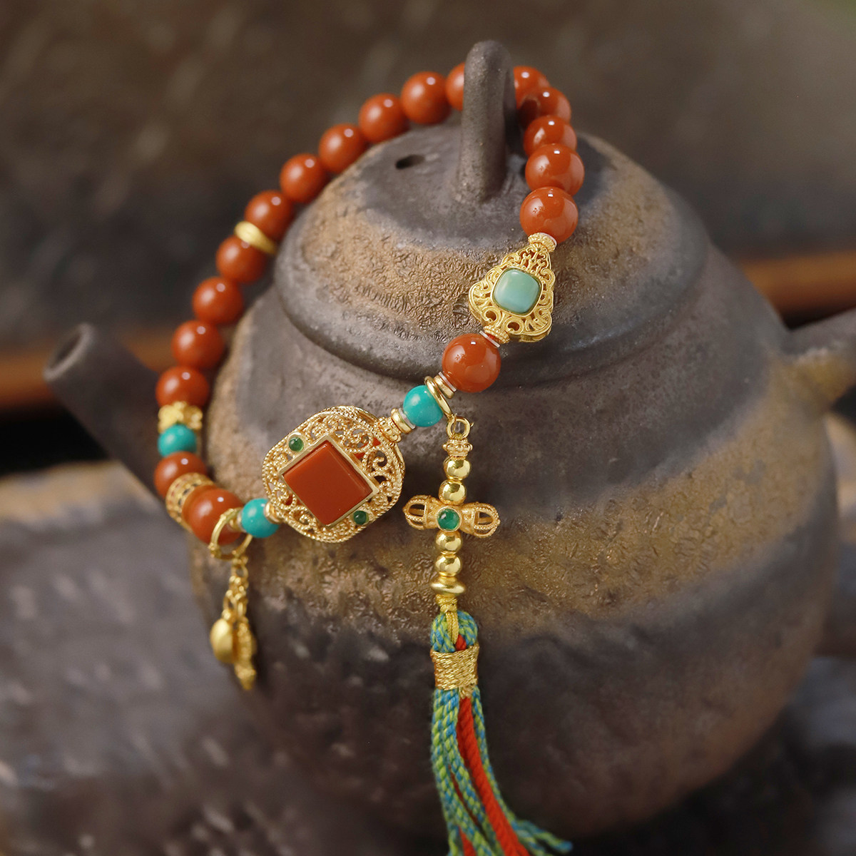 吉盟珠宝古法银南红玛瑙手串女手工编绳藏式文玩手链新中式国潮
