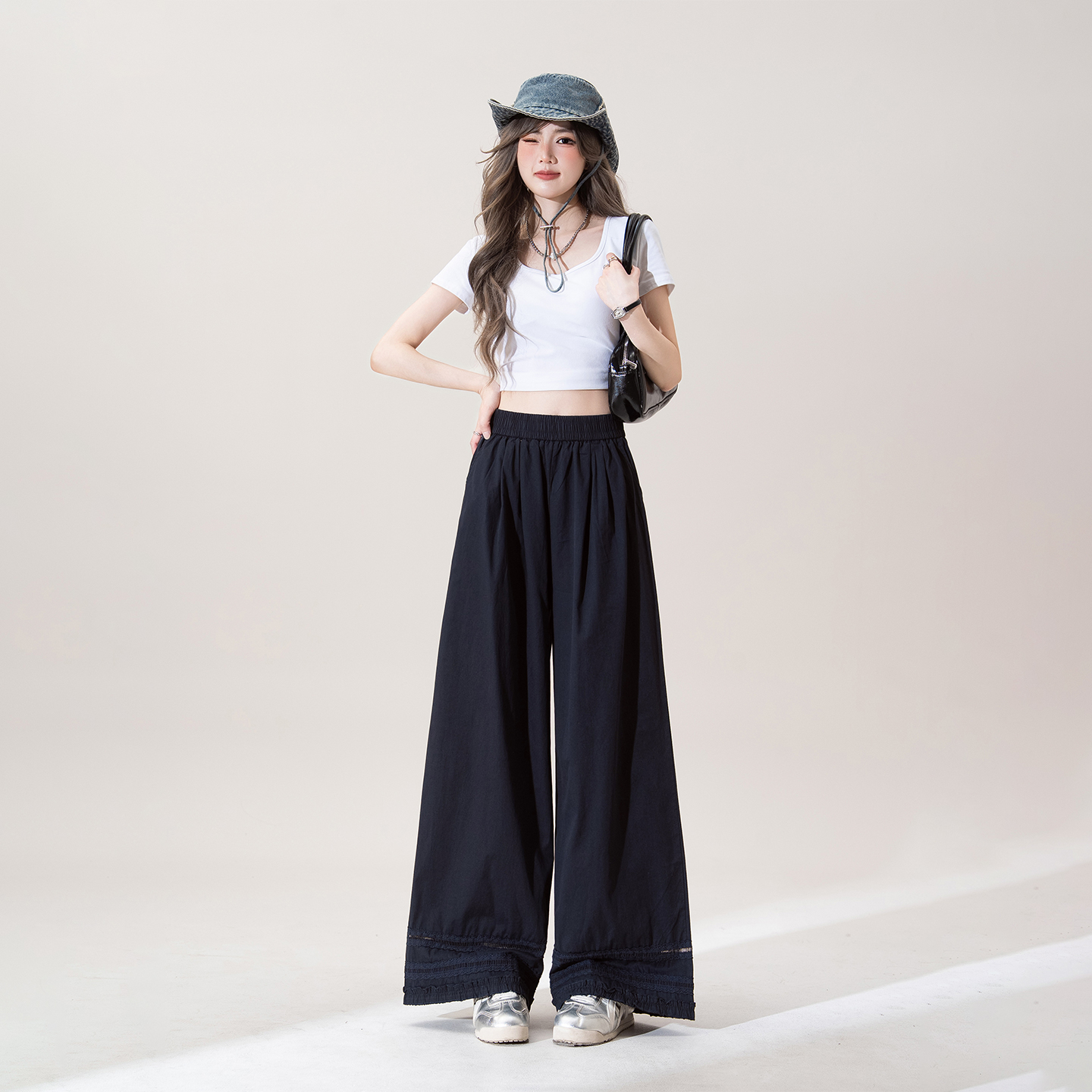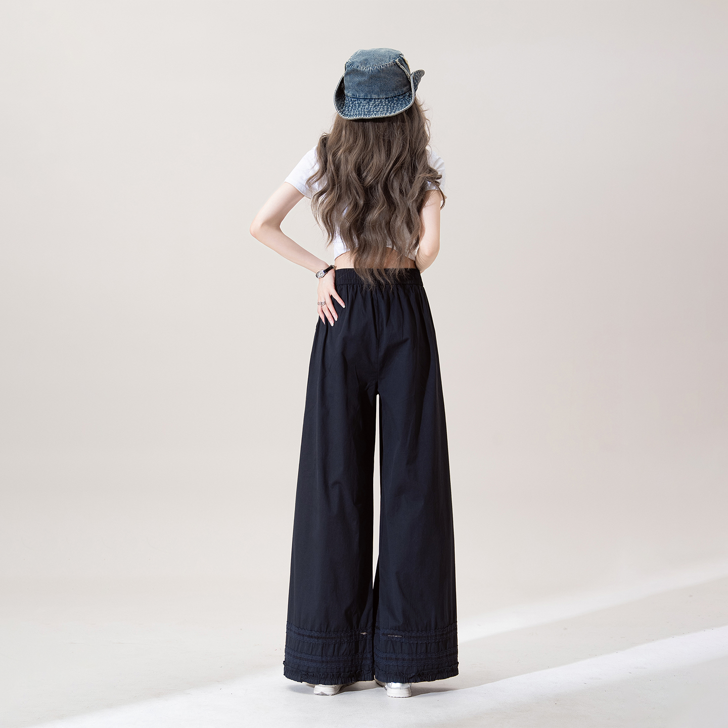 藏蓝色木耳花边镂空阔腿休闲裤女