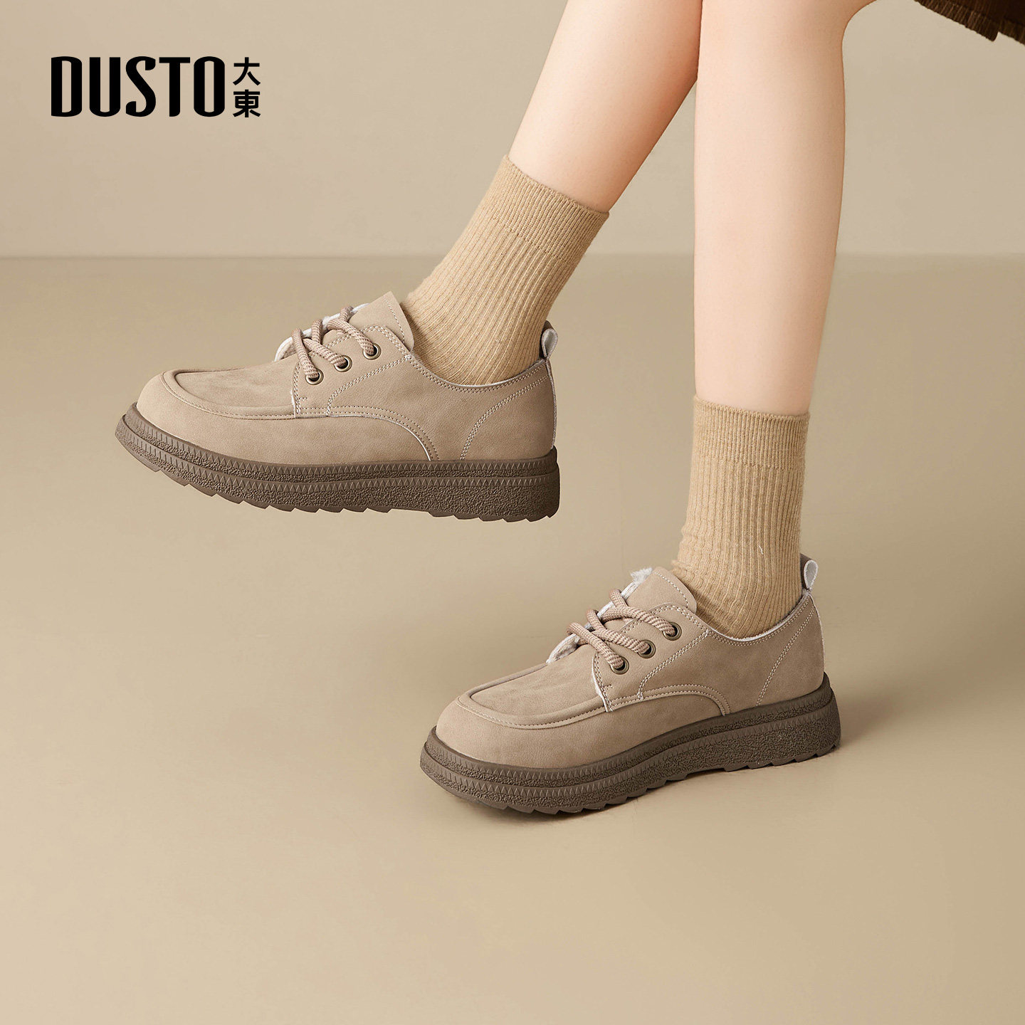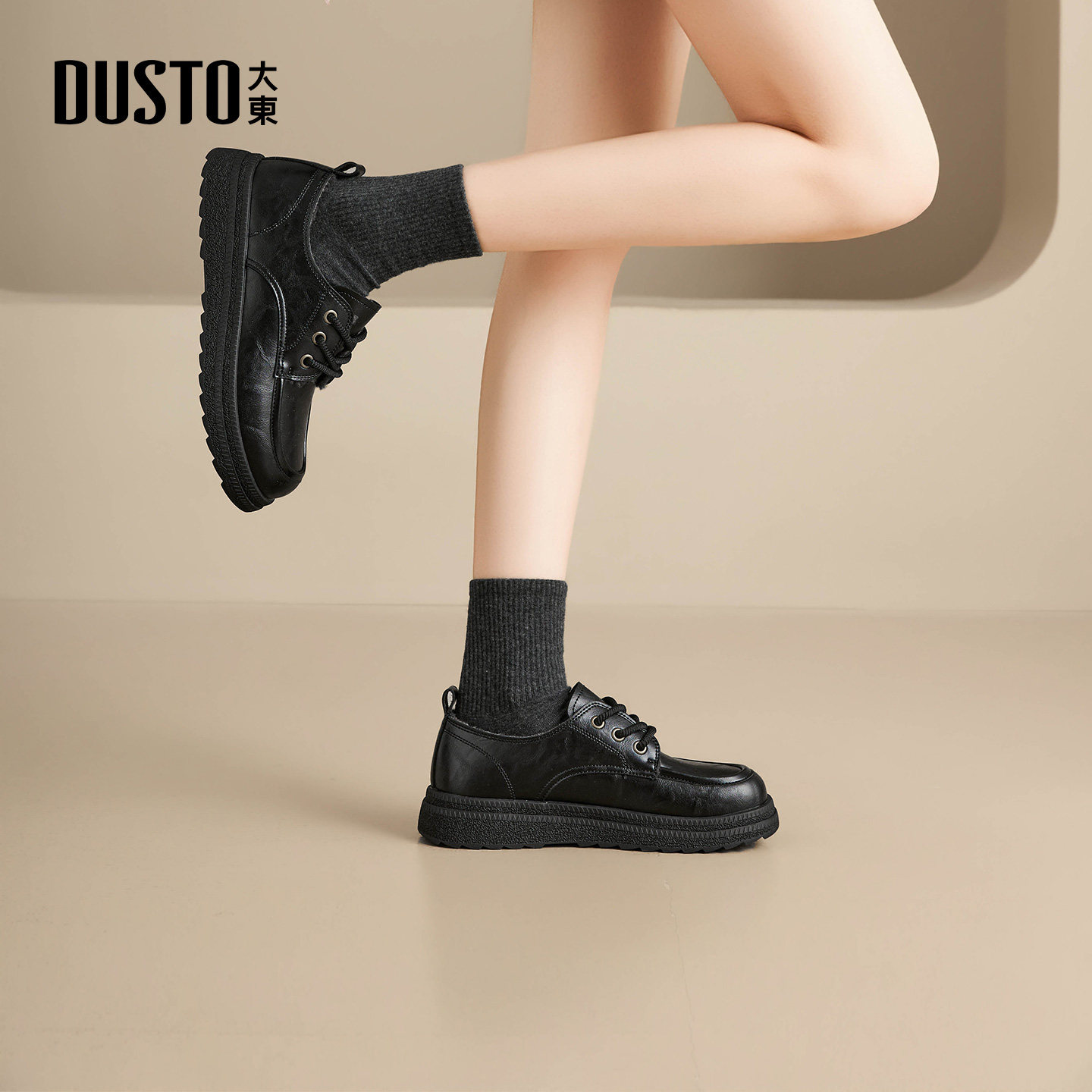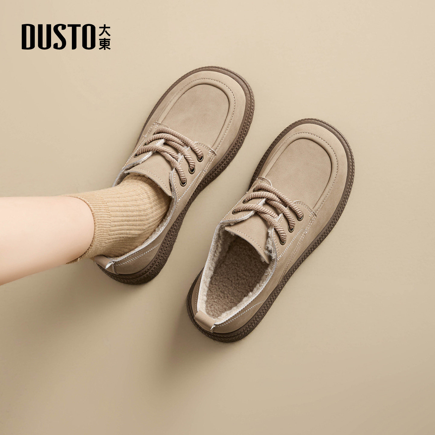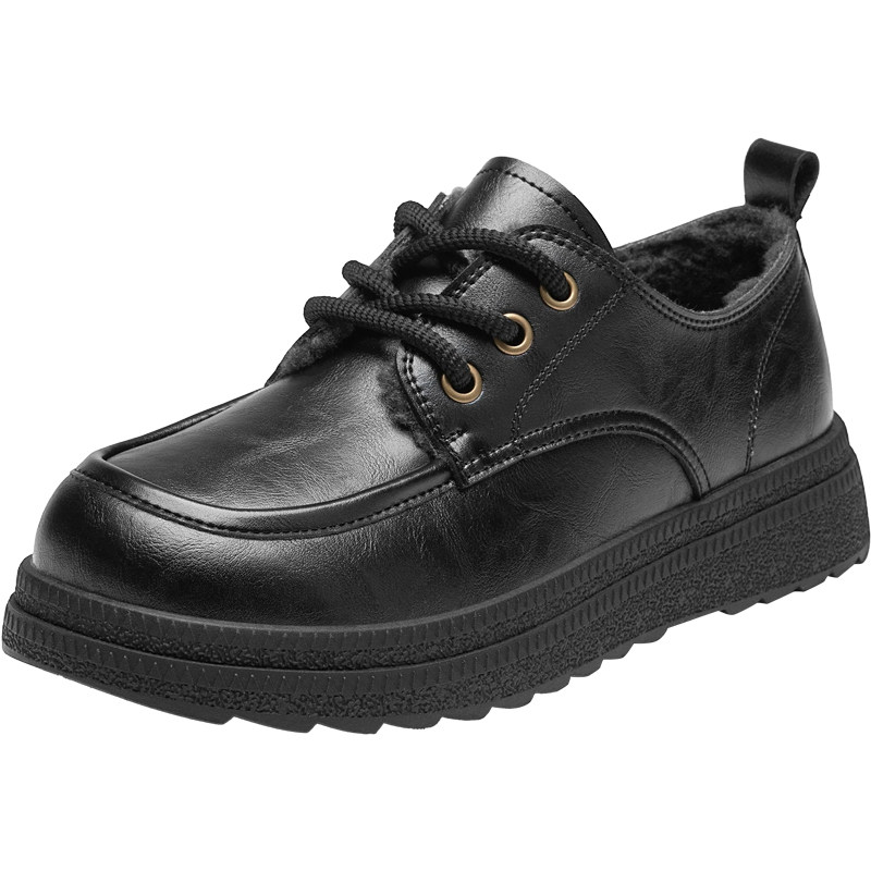 大东黑色加绒乐福鞋女2026新款冬季英伦风厚底系带小皮鞋保暖鞋子