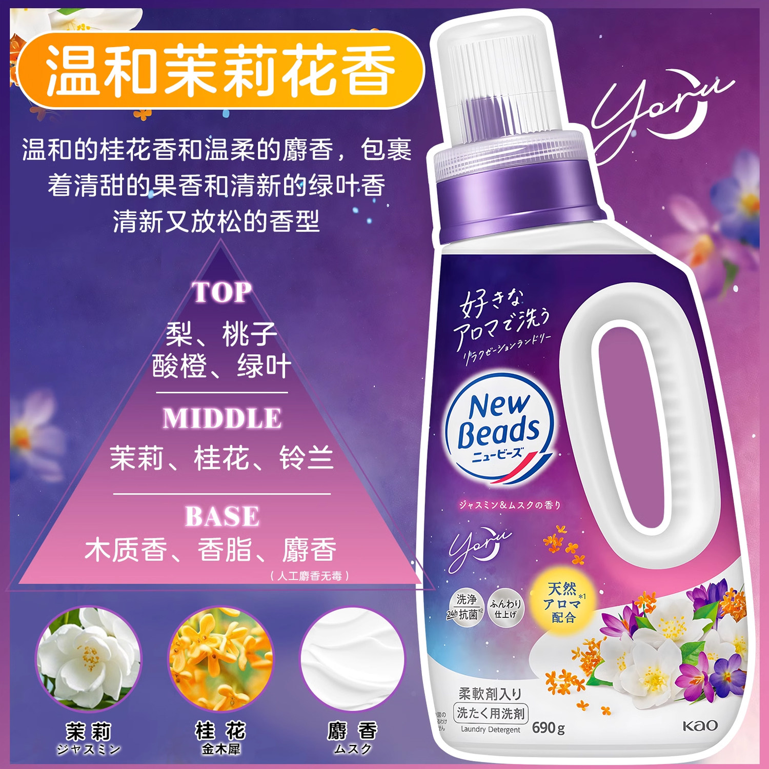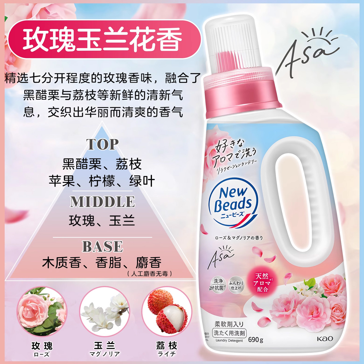 日本进口花王玫瑰花香洗衣液留香持久去渍净白含柔顺剂无荧光剂