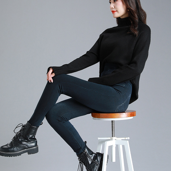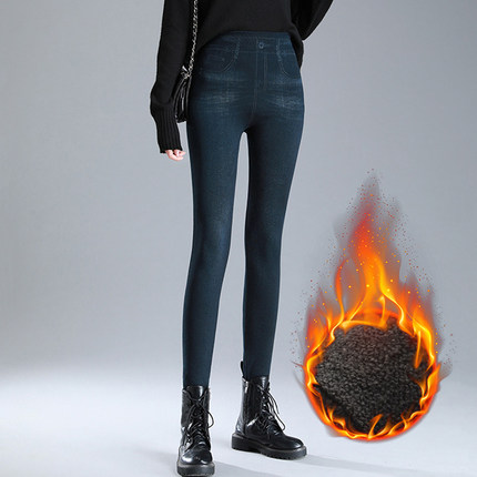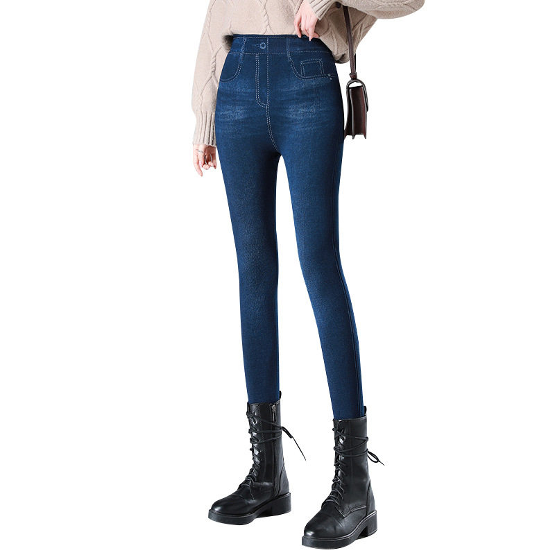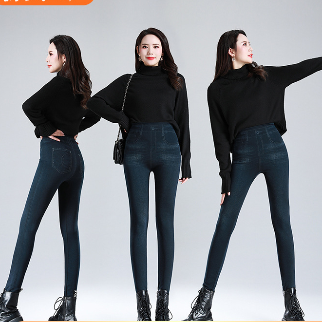秋季加薄绒高弹力仿牛仔打底裤女士加绒大码时髦紧身高腰小脚长裤