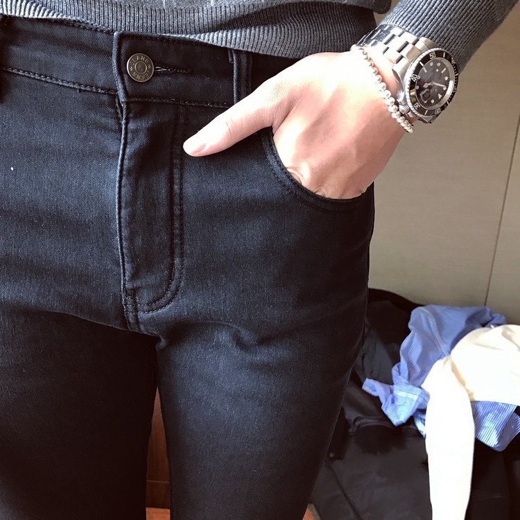 韩国东大门修身加绒牛仔裤男英伦韩版九平道休闲牛仔小脚裤百搭潮