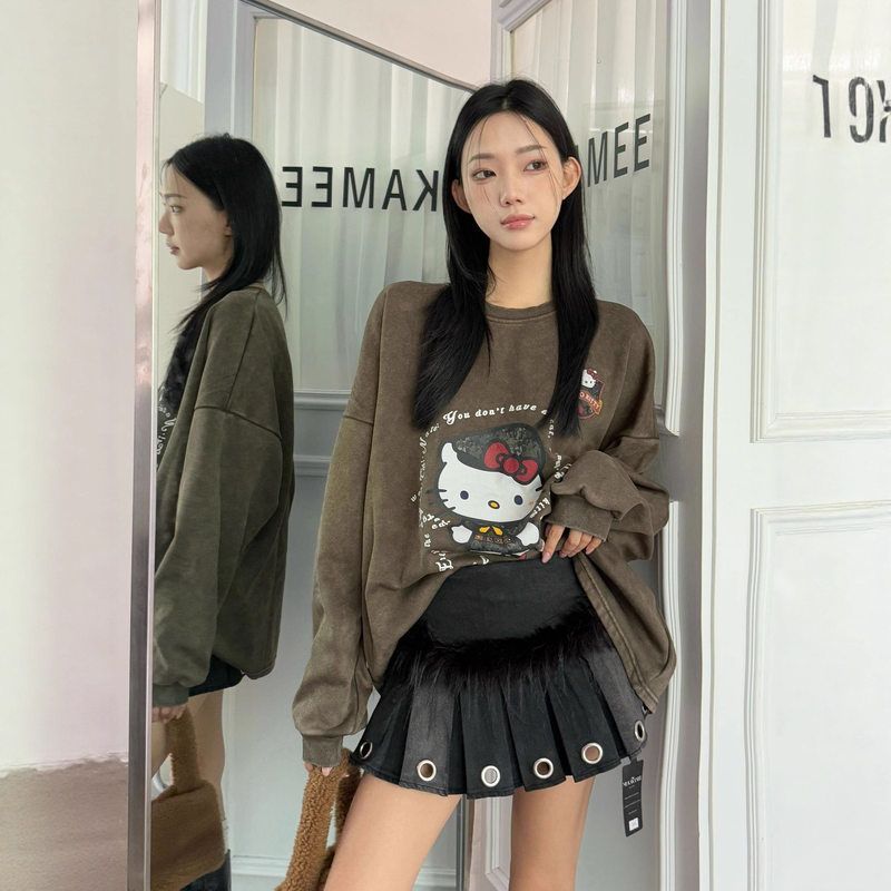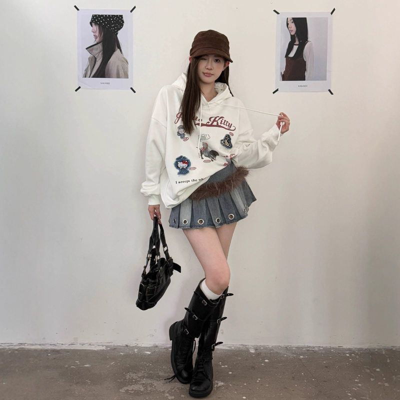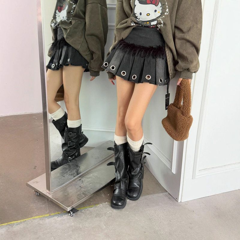 ME KAKAMEE十三行秋冬美式辣妹毛毛拼接百褶裙牛仔半身裙子 A3039
