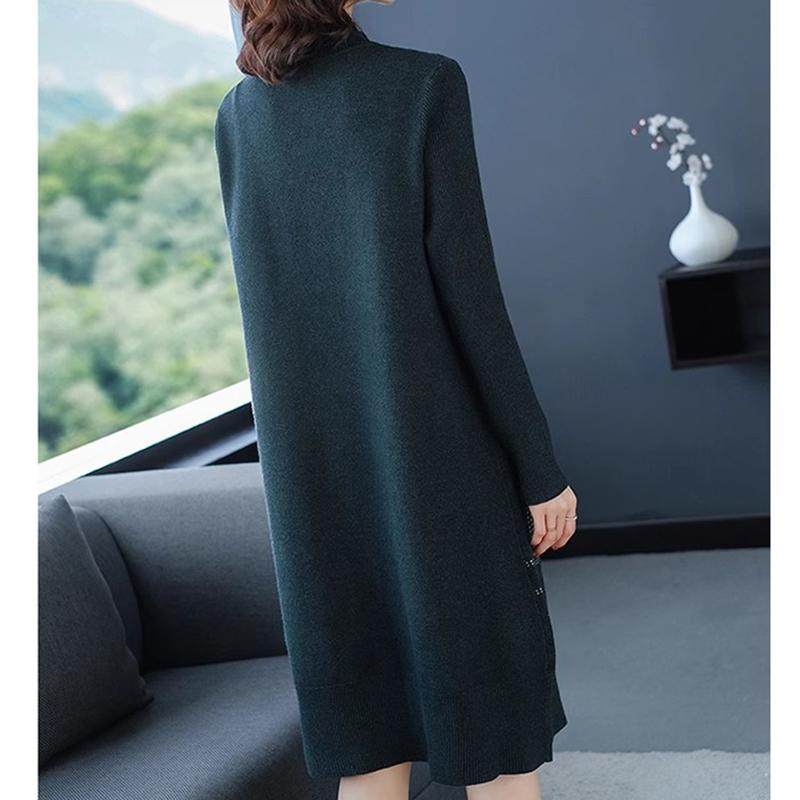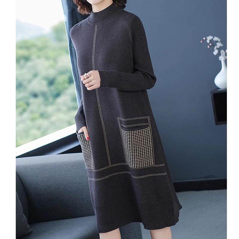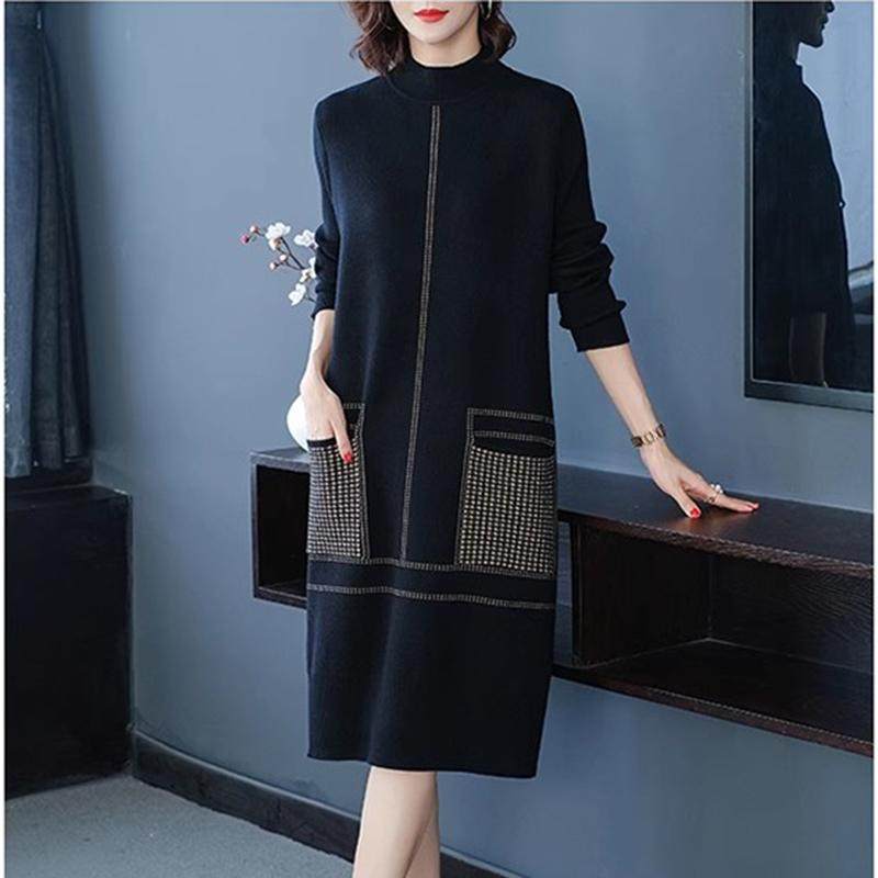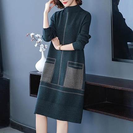秋冬新品羊毛针织衫厚款女士毛衣裙加大码口袋洋气过膝中长款毛衣