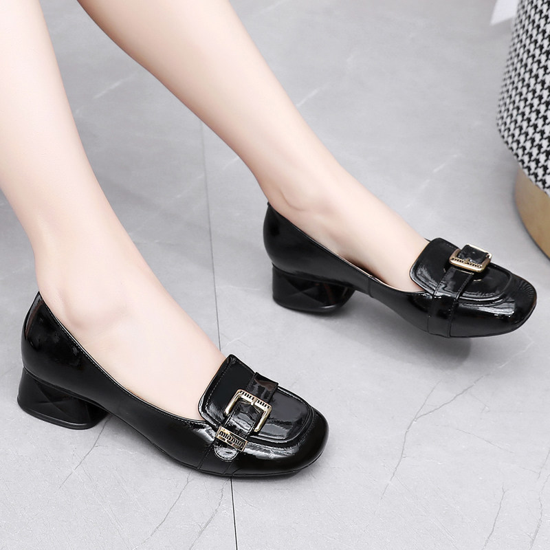 真皮粗跟单鞋百搭浅口漆皮乐福鞋