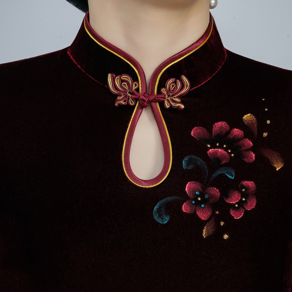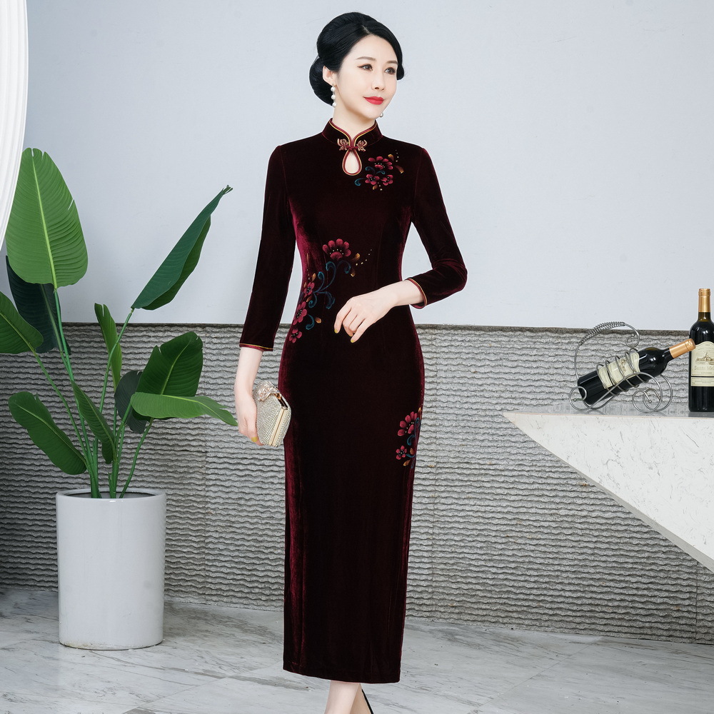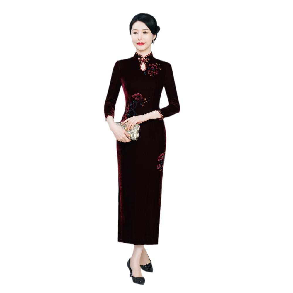 加绒金丝绒连衣裙秋装新款改良丝绒旗袍女古法长款气质喜婆婆礼服