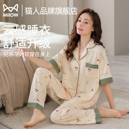 猫人睡衣女夏季开衫短袖长裤套装