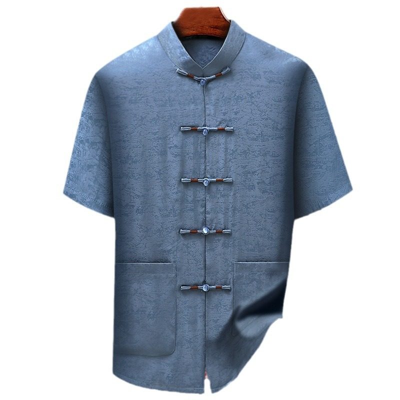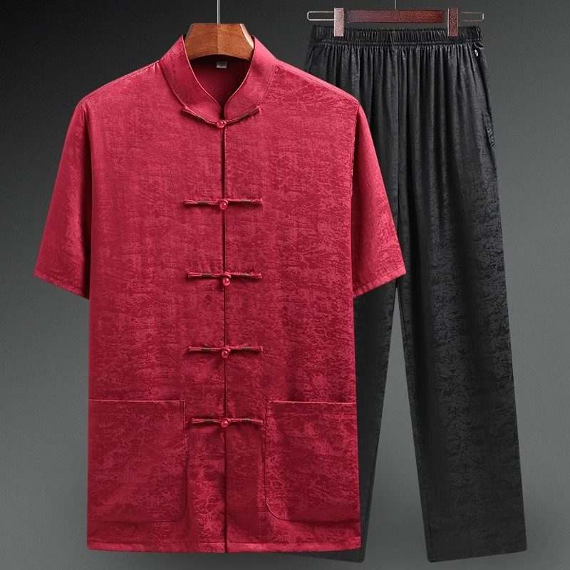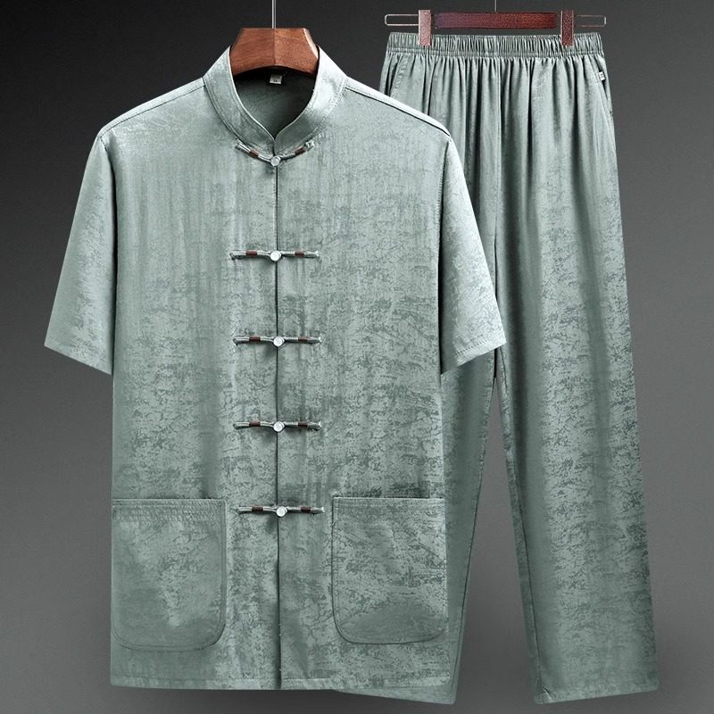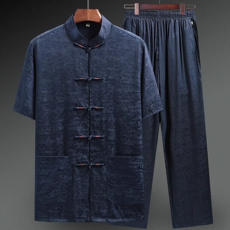 高版唐装男士冰丝短袖套装老人爷爷夏天衣服中国风男装中老年爸爸