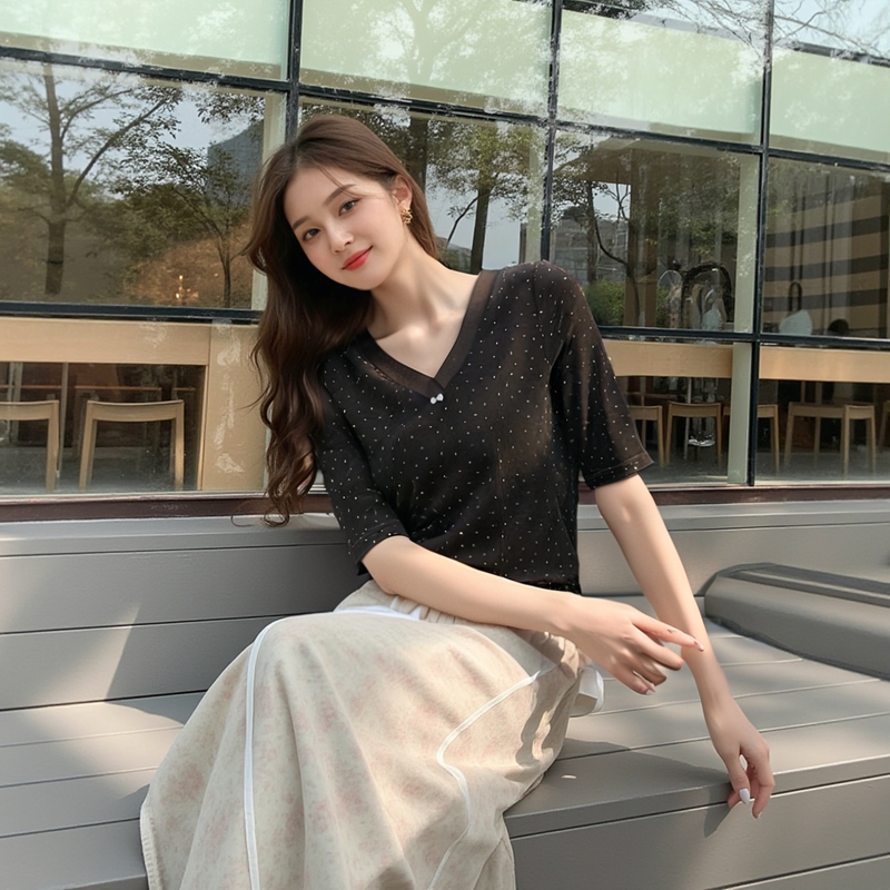 245048南油高端欧洲站高货轻奢女装粘胶丝绒洋气V领五分袖上衣