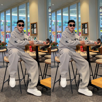 直播间同款秋季男款连帽卫衣美式高街十字花设计休闲卫裤运动套装