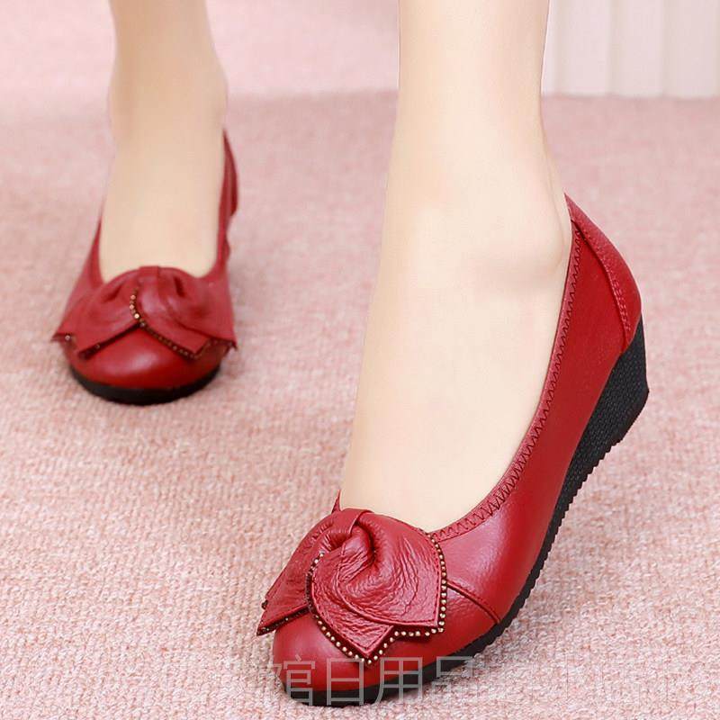 正品春秋坡跟中老年单鞋适软皮鞋平底软皮舒透气中跟妈妈鞋真女皮