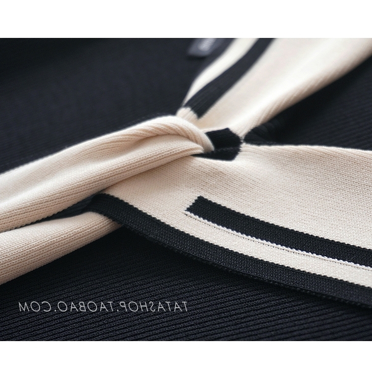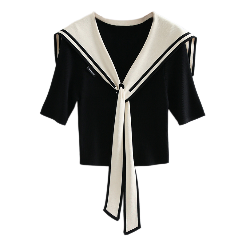 一线品牌外贸撤柜女装冰丝针织黑白撞色飘带海军领短袖针织T恤女
