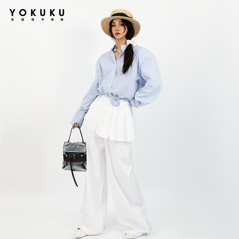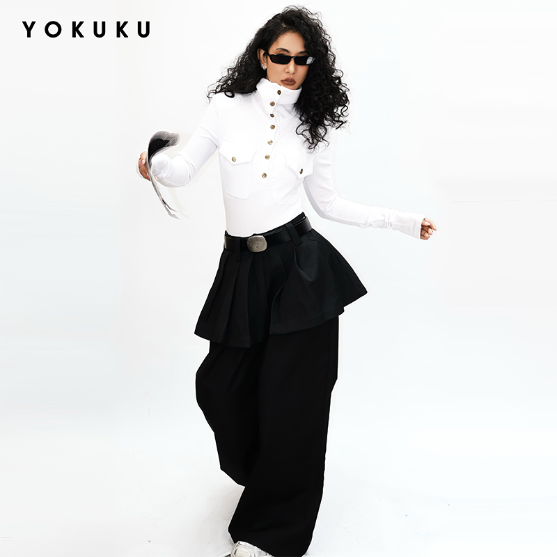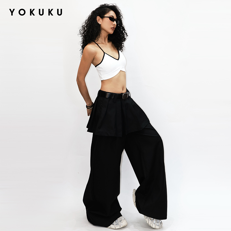 哟酷酷(西装公主)美式复古假两件休闲裤百褶裙西装直筒阔腿裤女