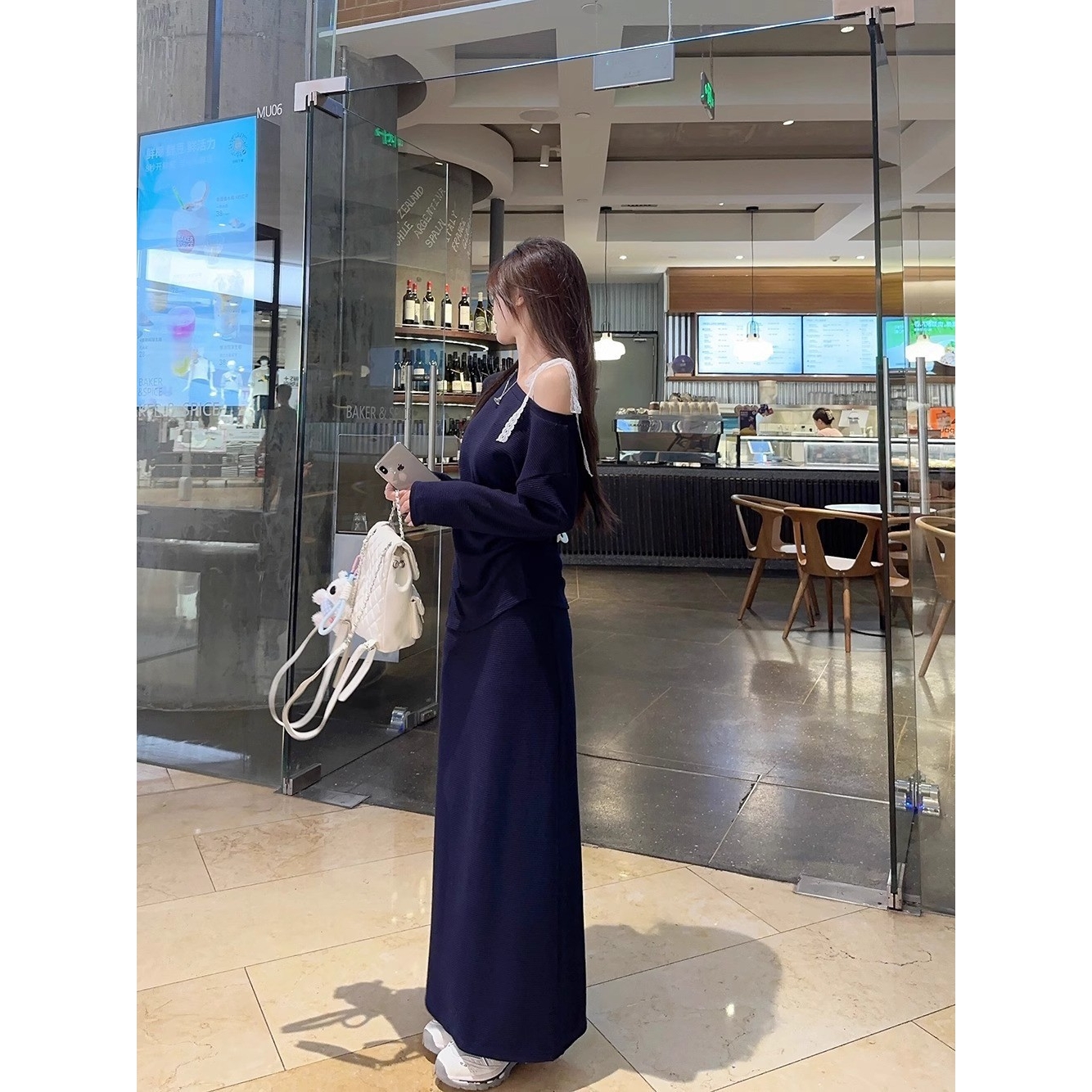 气质套装小众蕾丝蝴蝶结系带针织衫女早秋高腰开叉半身长裙两件套