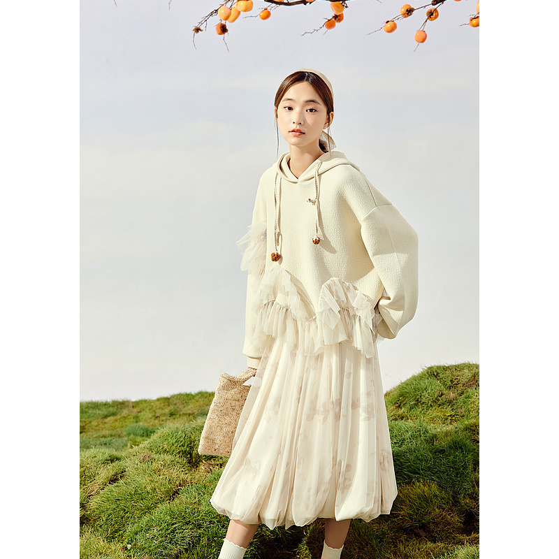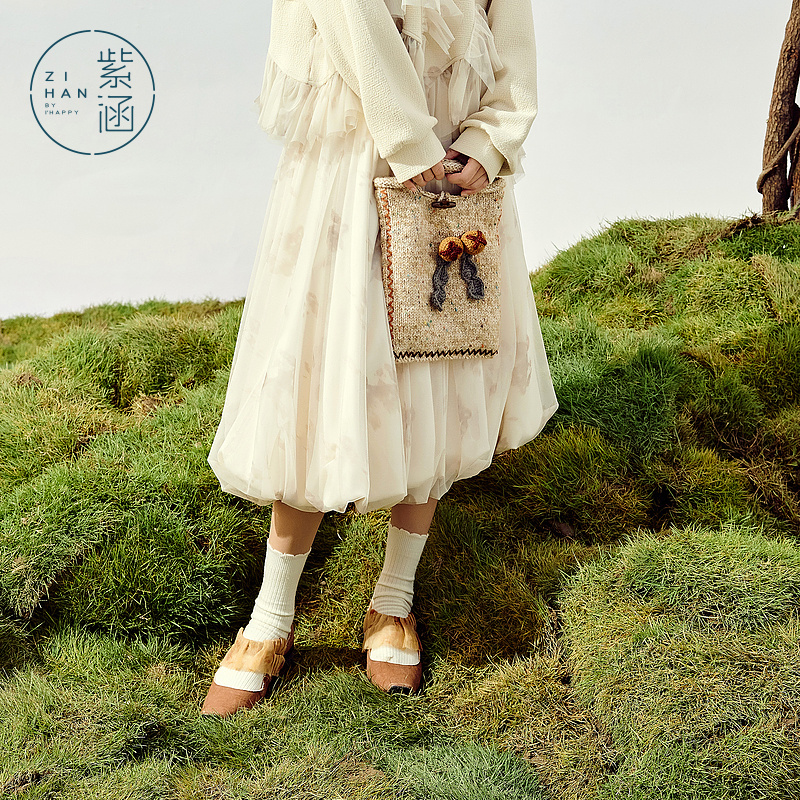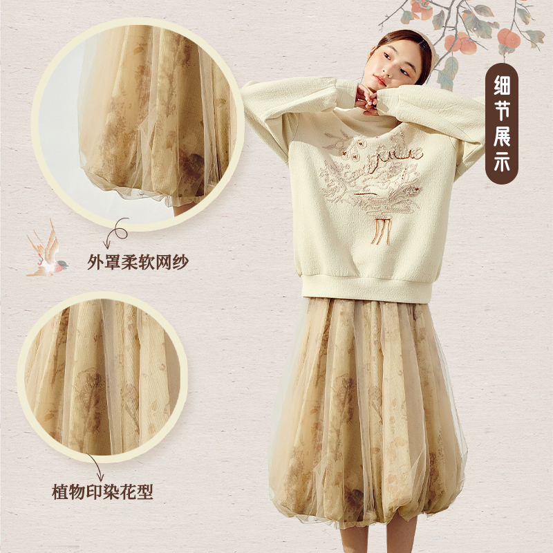 紫涵植物印染半身裙女冬季新款加厚网纱仙女裙森系抽褶中长花苞裙