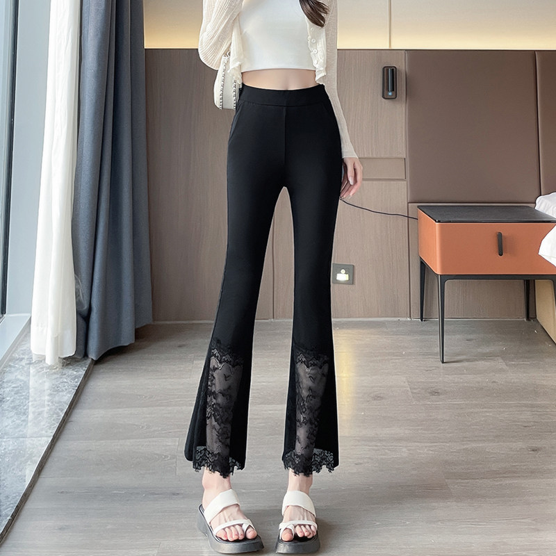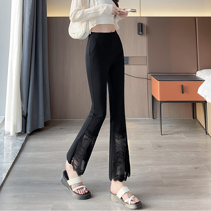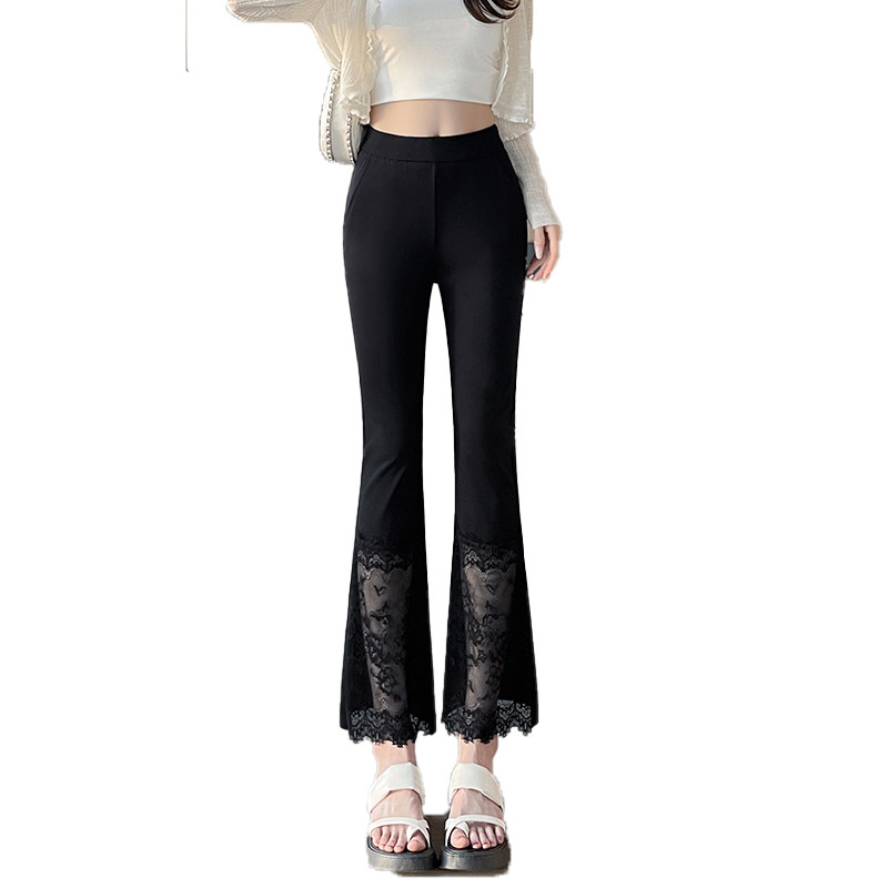 2025新款蕾丝拼接黑色微喇叭西装裤女夏高腰显瘦九分休闲裤西裤潮