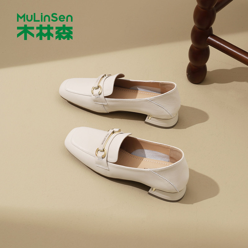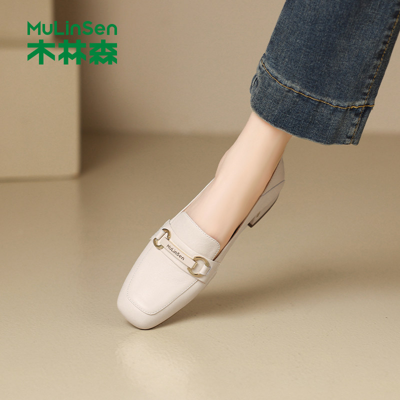 木林森女鞋2025秋季新款法式粗跟鞋金属乐福鞋女士一脚蹬浅口单鞋