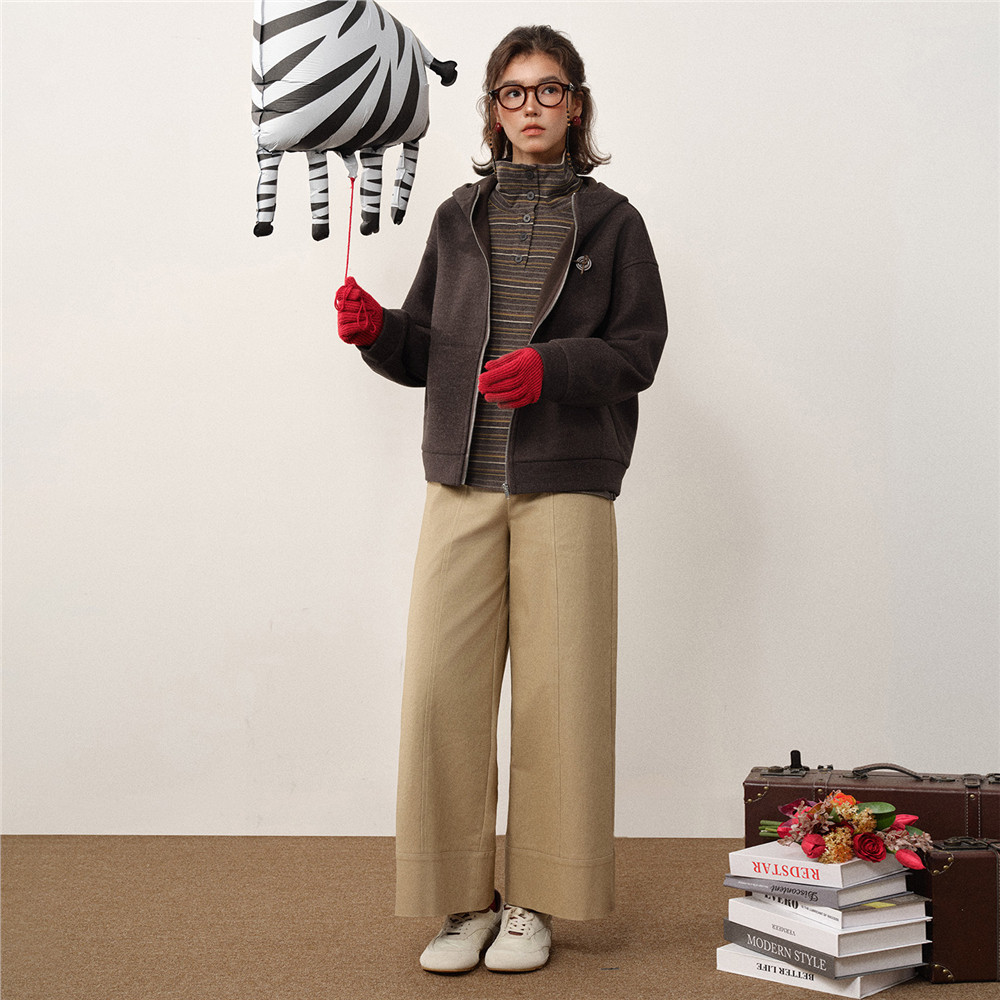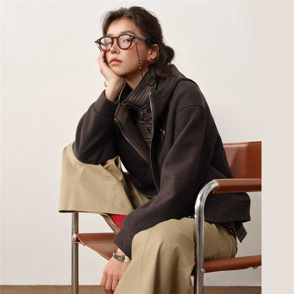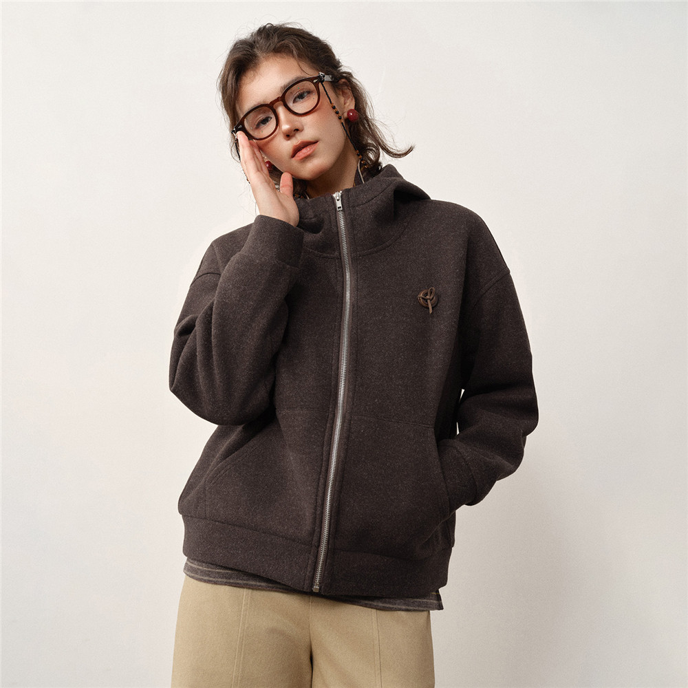 设计师款佐丹奴新款宽松加绒立体胸章连帽拉链毛呢外套女18375921