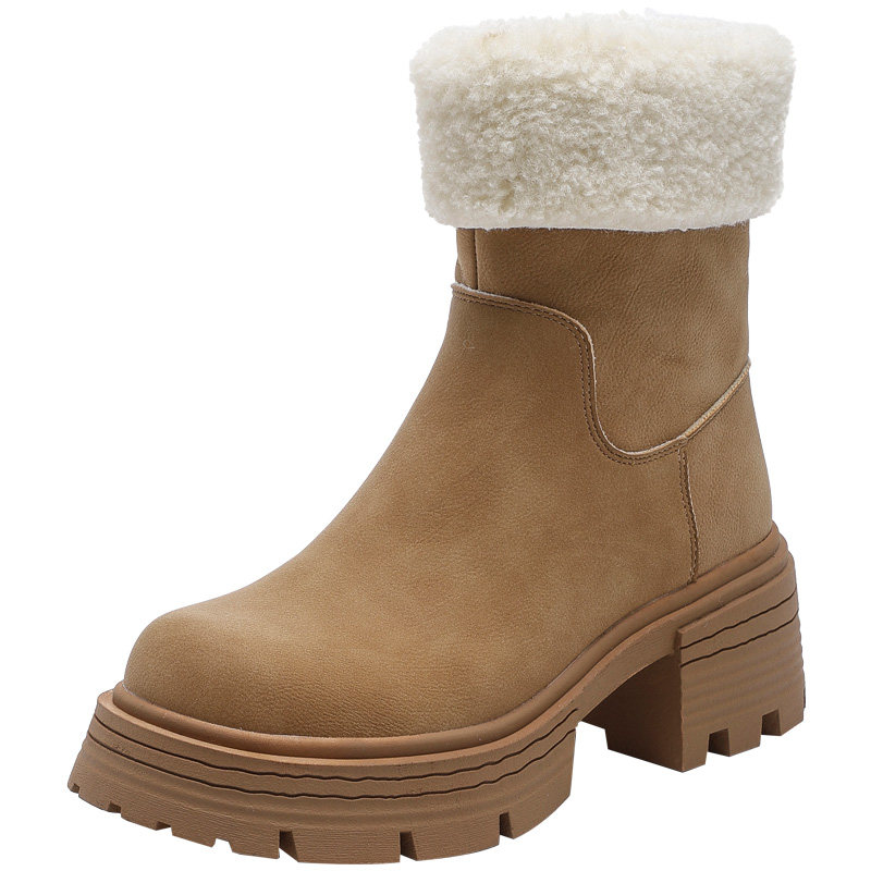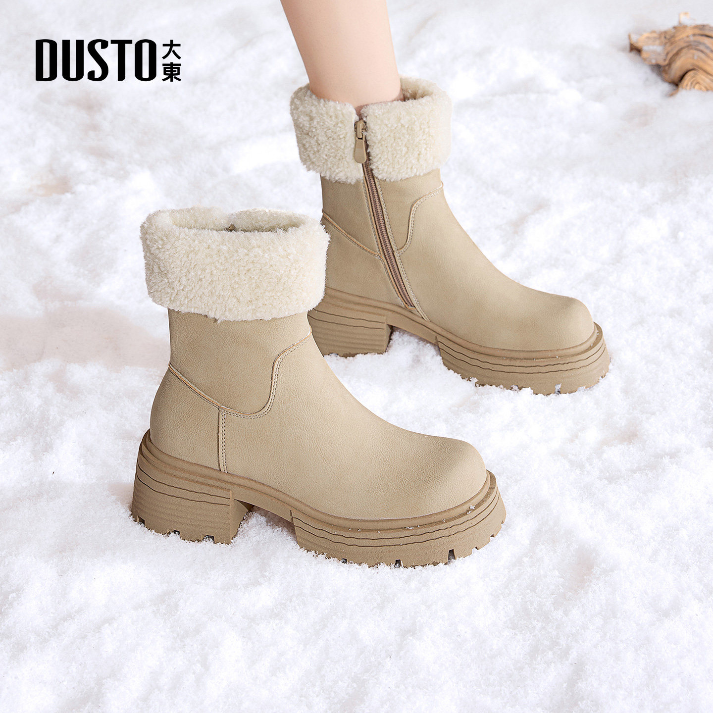 大东厚底加绒雪地靴女款2026新款冬季粗跟棕色雪地短靴棉鞋毛毛鞋