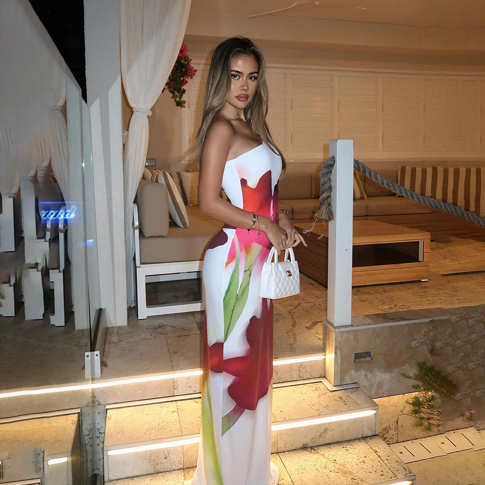新款欧美2025夏季沙滩风单价无袖连衣裙性感时尚印花修身长裙