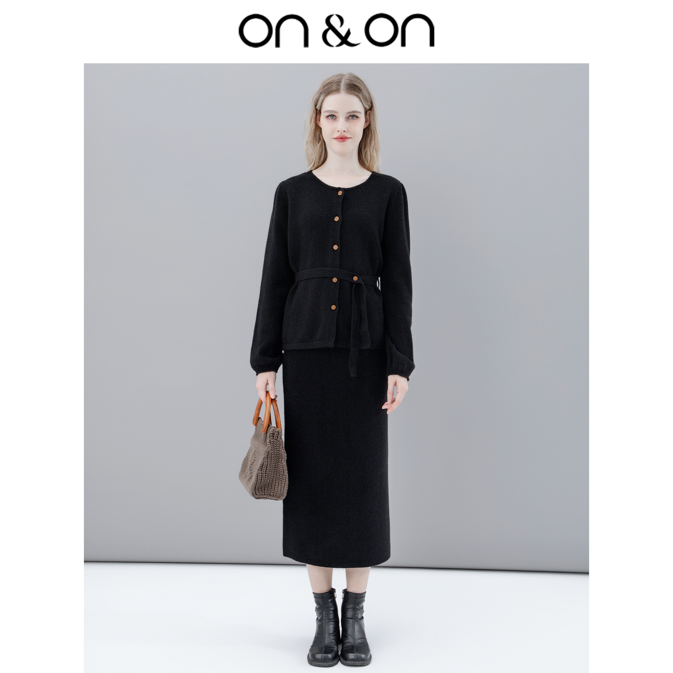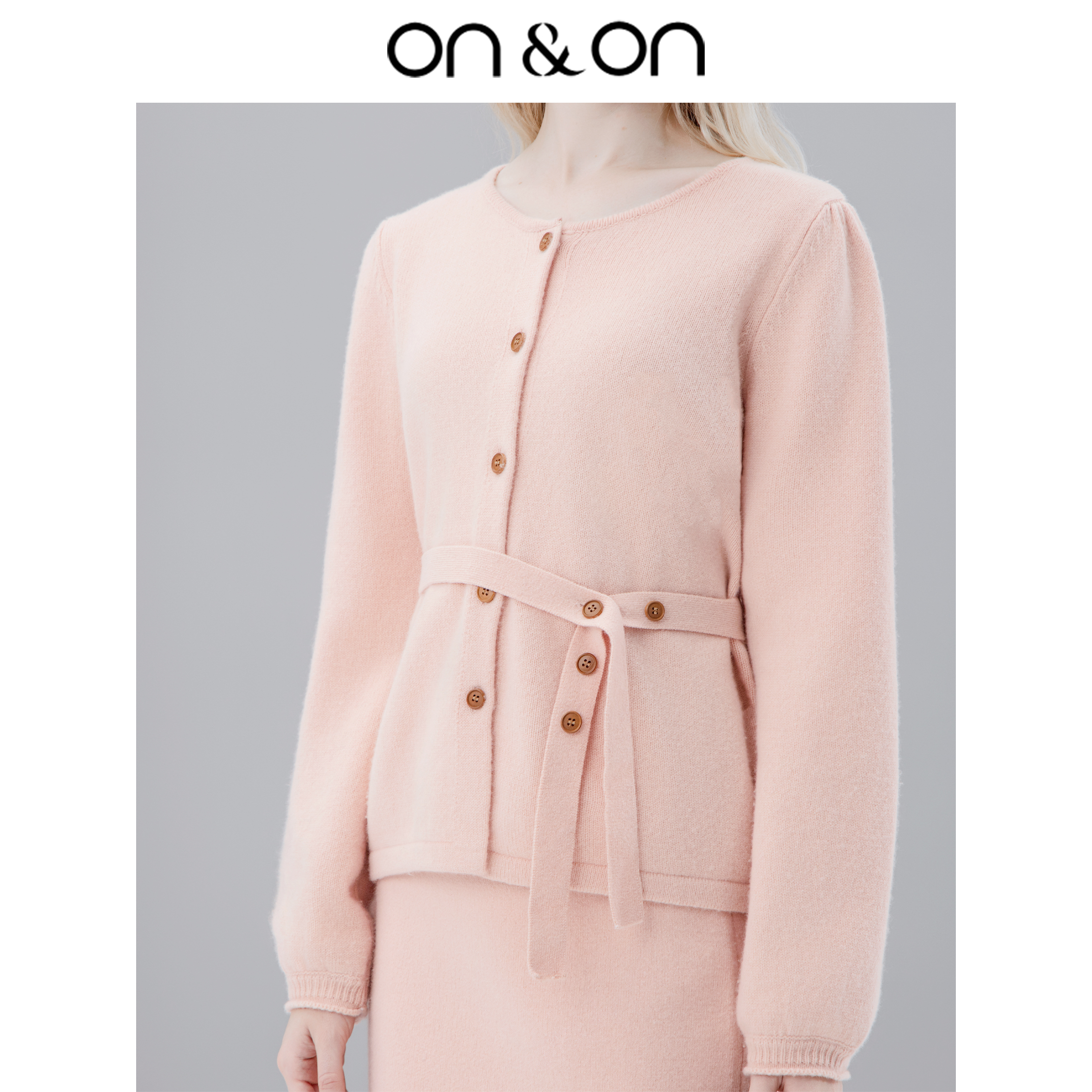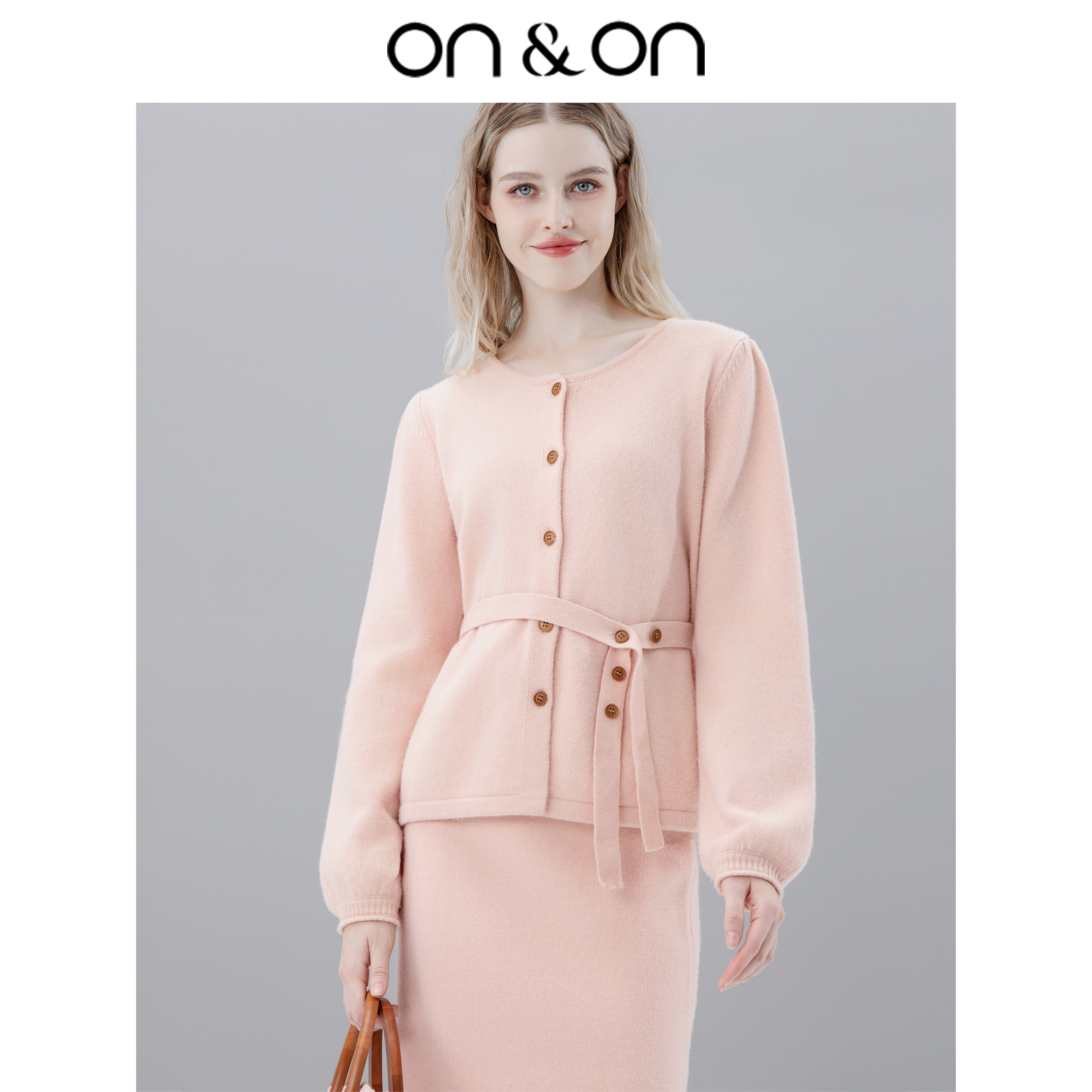 ON&ON/安乃安韩系圆领减龄纯绵羊毛粉色针织绑带开衫+半裙套装
