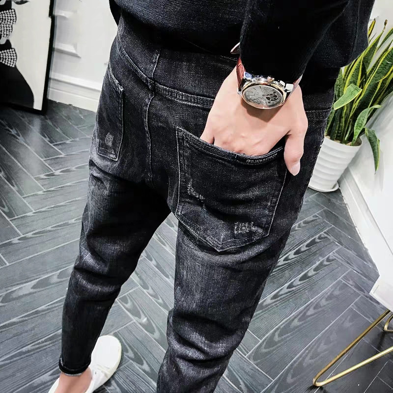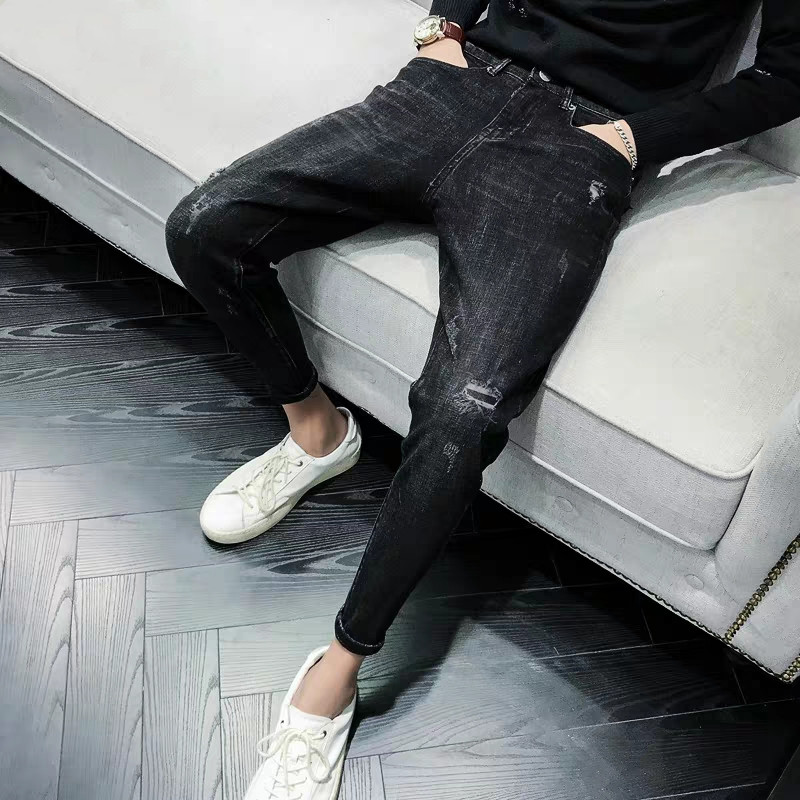 黑色牛仔裤男破洞九分裤潮流冬季加绒长裤弹力修身小脚裤抓毛薄绒