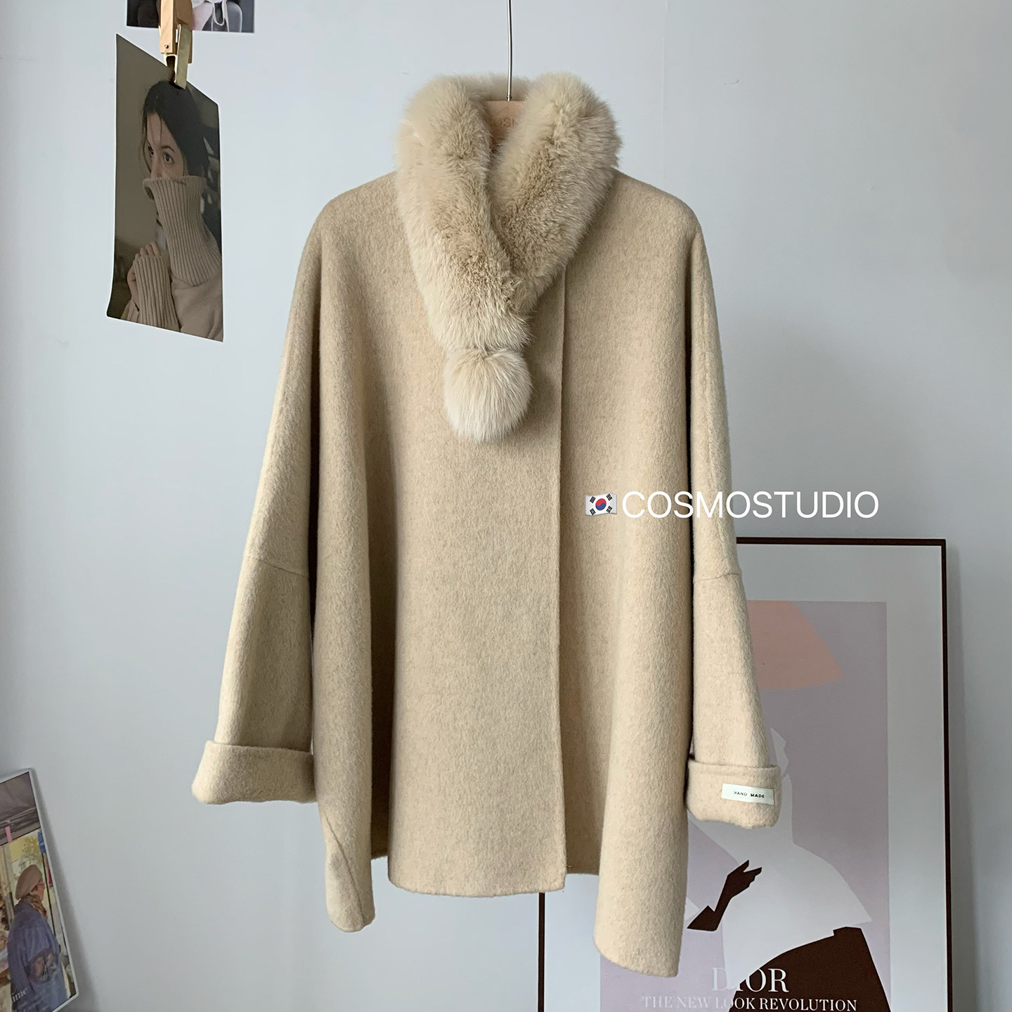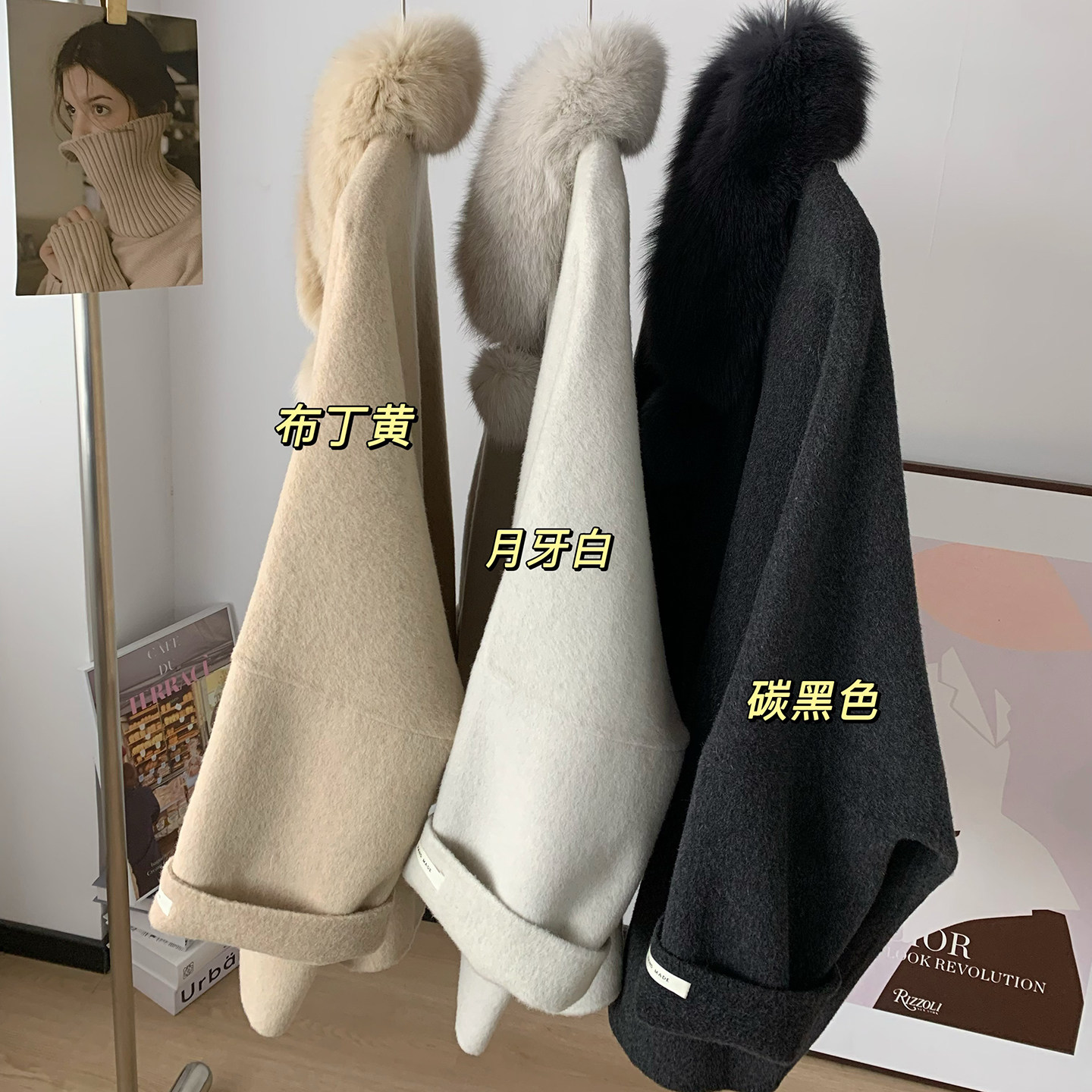 韩国东大门狐狸毛领围巾双面羊毛呢子大衣斗篷外套女阔版冬季新款