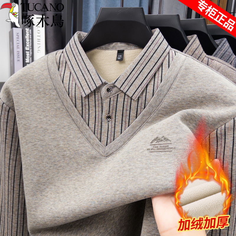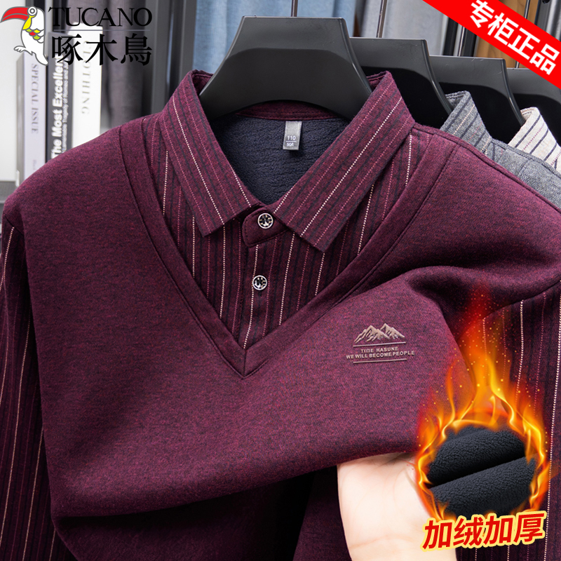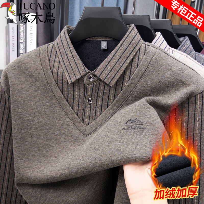 啄木鸟男士中年高档羊毛衫假两件秋冬衬衫领加绒加厚保暖百搭毛衣