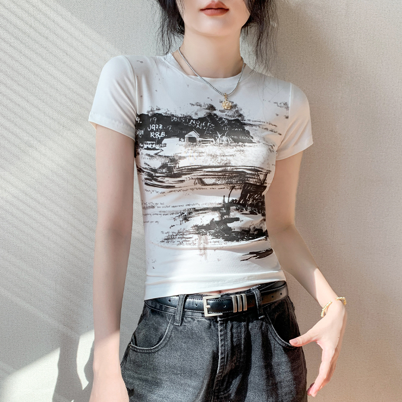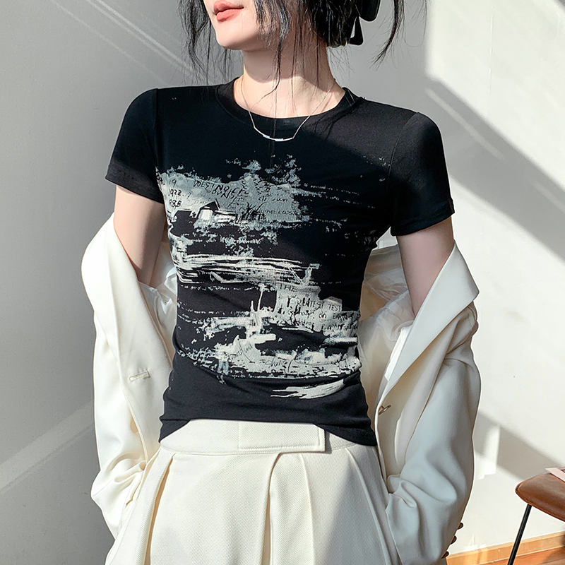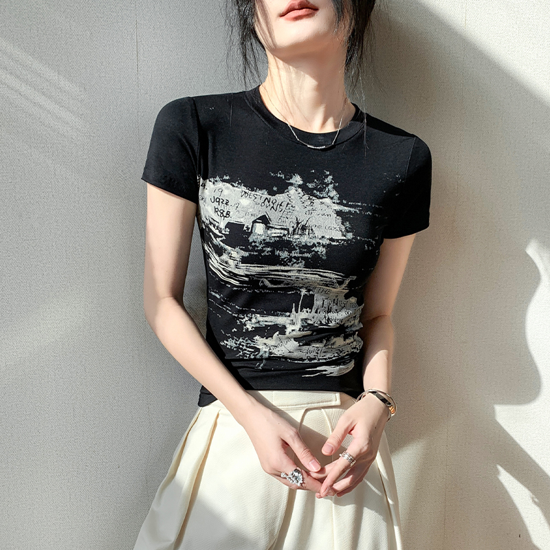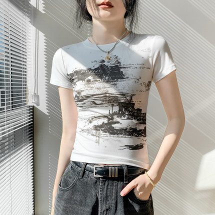 歌倍尚莱赛尔印花正肩短袖T恤女修身显瘦设计感小众衬衫内搭上衣