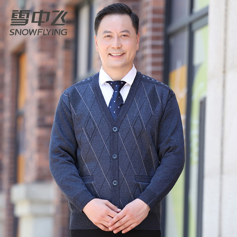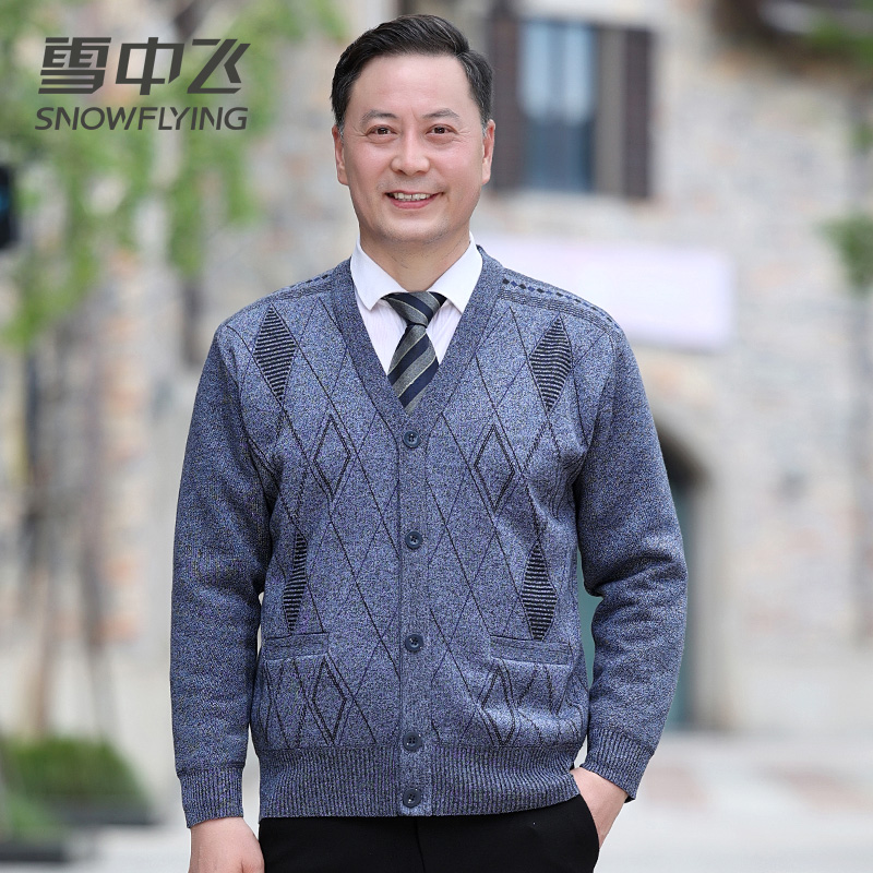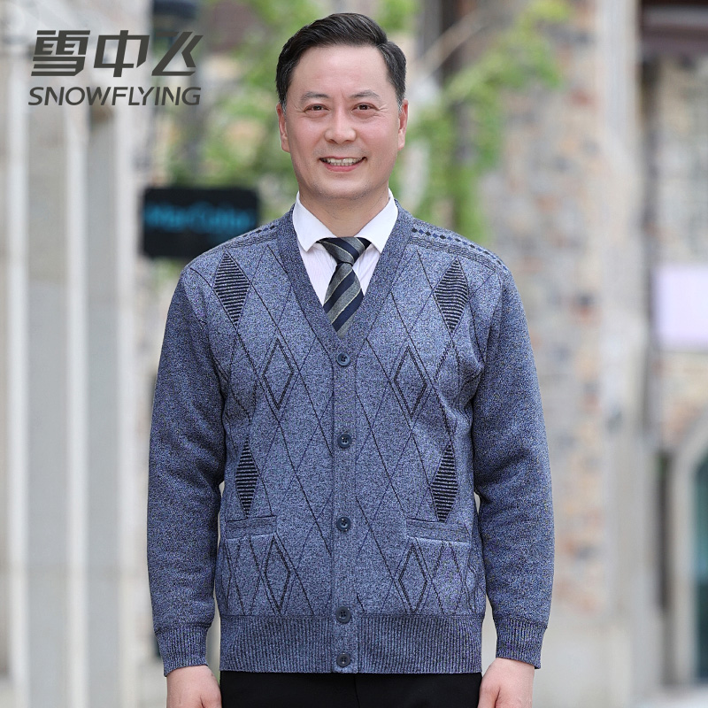 雪中飞中老年男士针织开衫外套秋冬季爸爸装加绒加厚保暖爷爷毛衣