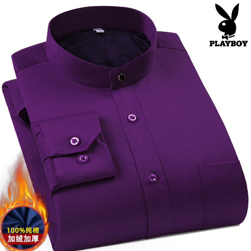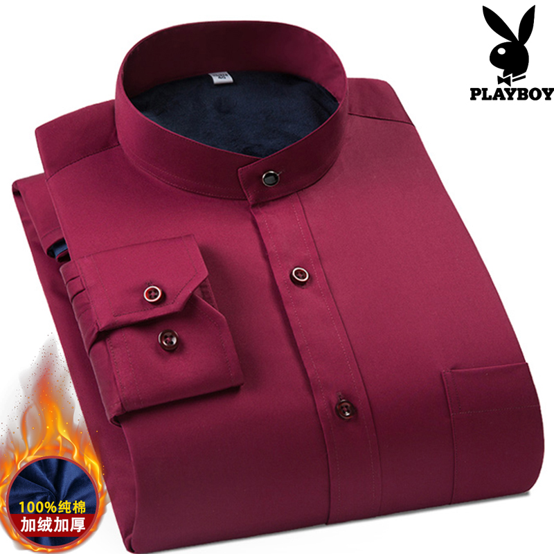 花花公子100%纯棉中式立领衬衫男加绒加厚长袖中山装中年保暖衬衣