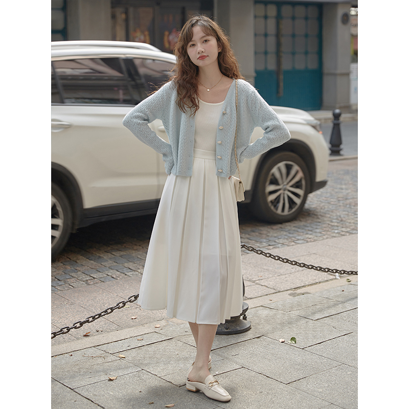 法式温柔奶油蓝色针织开衫女2024春秋v领宽松小个子短款上衣