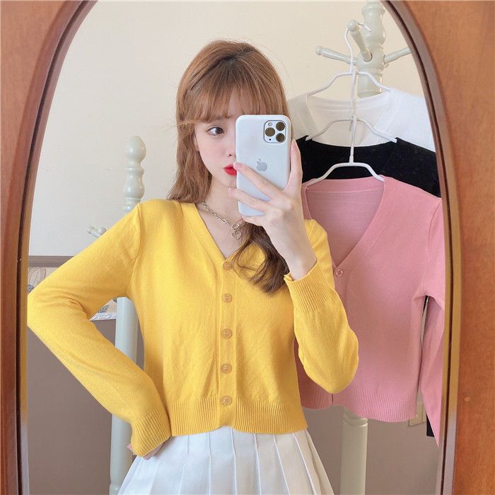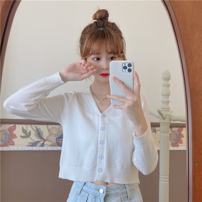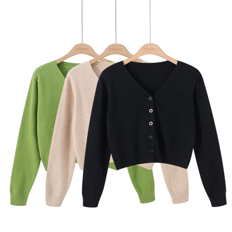 宽松春秋小短款高腰长袖女上衣毛衣短小外套v领针织衫开衫小外搭