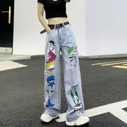 2025年流行夏季女装新款洋气卡通涂鸦印花破洞水洗牛仔阔腿裤长裤